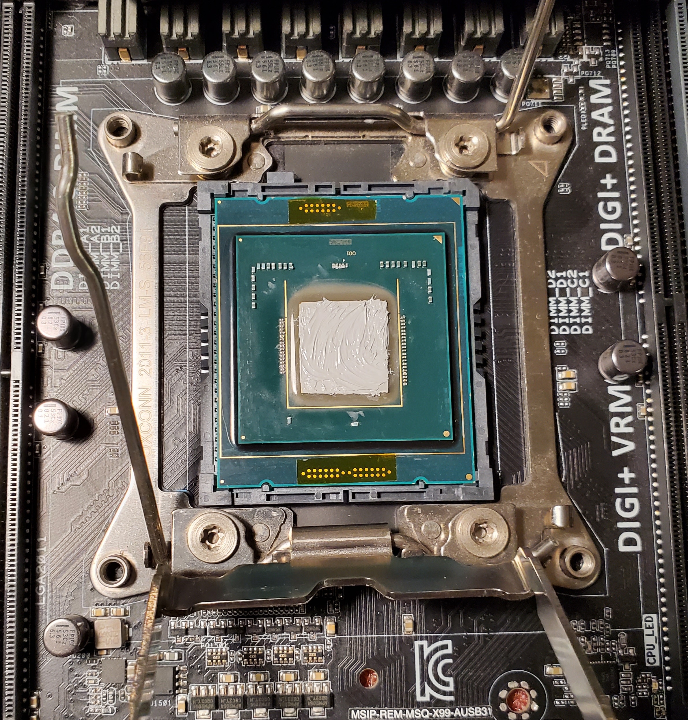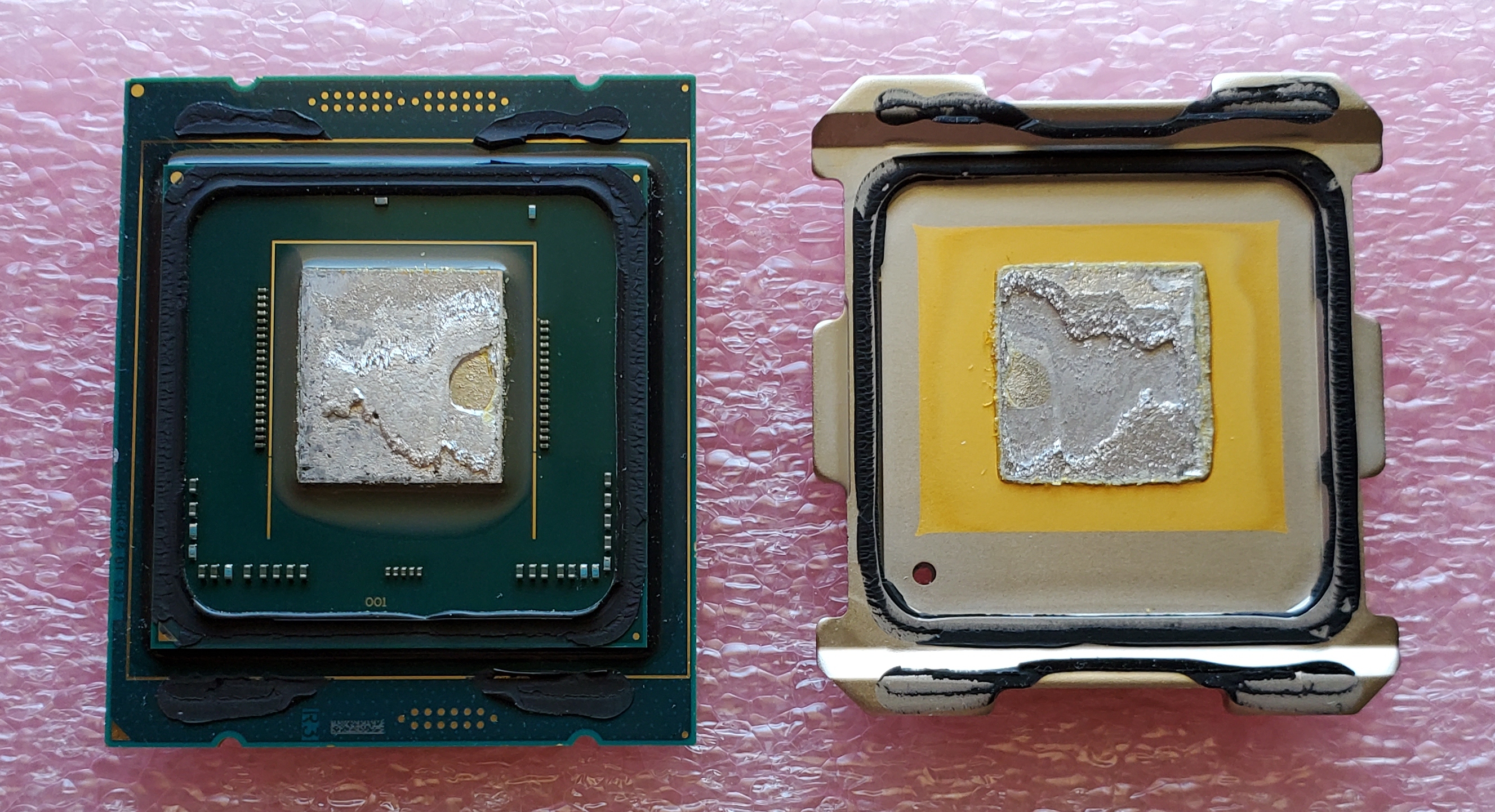 Вобщем зачистил я этот термоинтерфейс и герметик. Решил поставить куллер прям на кристалл, как сделал тот чел для E5-2699v4. Очевидно что прижим сокета больше не будет прижимать проц, т.к. крышки-то через которую он прижимает больше нету.
