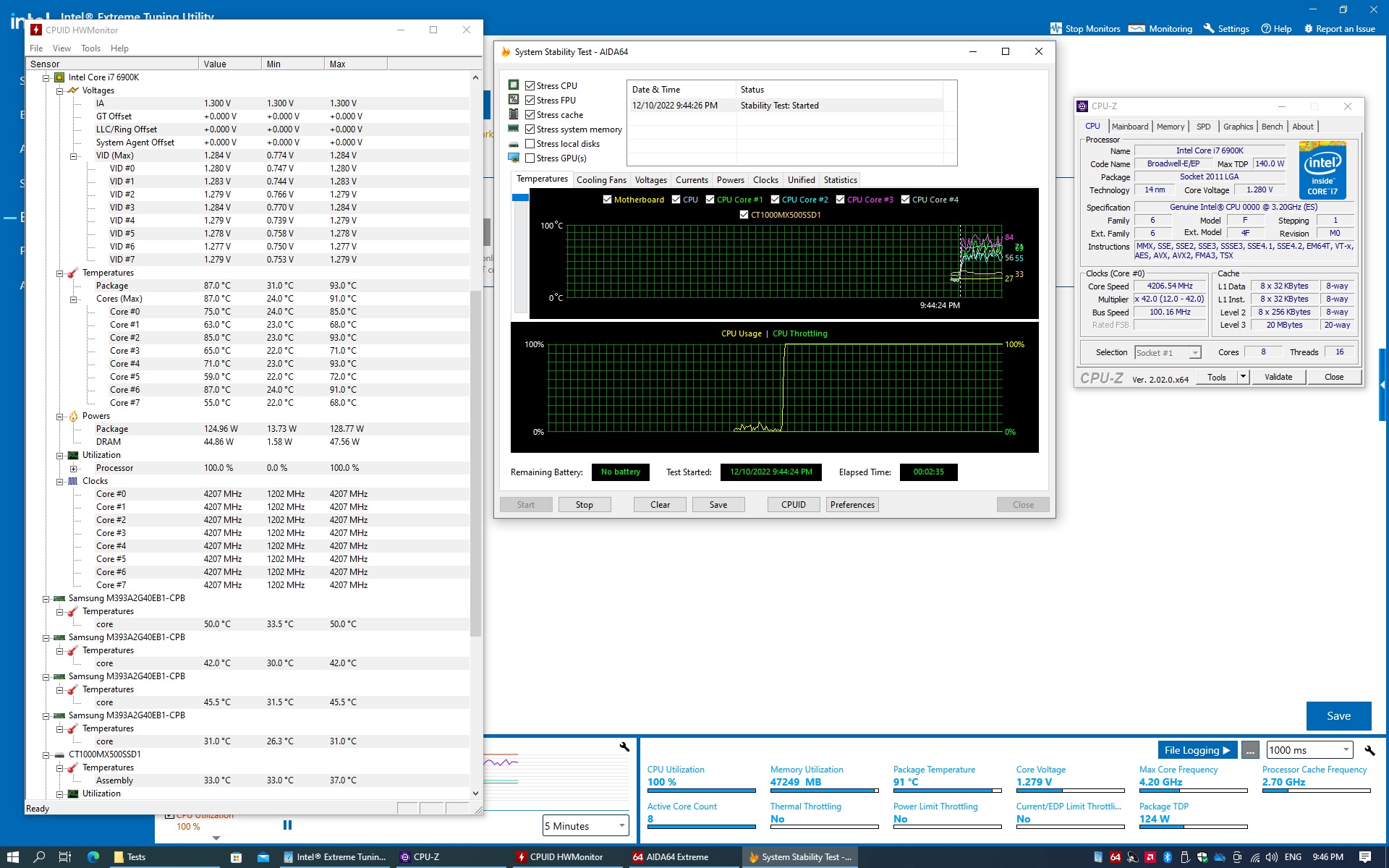 Ну думаю прижму куллером. Очевидно что кулер нужен с никелированной полированной подошвой без торчащих тепловых трубок и с нормальным креплением, а не китайским пластмассовым кольцом. Достал из загажника be quiet! Dark Rock 4, и вот засада, из-за того что проц теперь ниже на толщину крышки, то кулер прижать к процу не получается, стойки слишком высокие. Покопался в барахле и нашёл стойки пониже, от куллера GI-46U. Аккуратно поставил кулер, закрутил два прижимных винда пальцами как мог. Воткнул DDR4 тестер в слот памяти и начал потихоньку равномерно затягивать оба винда отвёрткой до того момента как все cветодиоды на DDR4 тестере загорелись. Если перетянуть, то можно расколоть кристалл процессора ну и на этом закончить эксперимент. Если не дотянуть, то ничего работать не будет, из-за отсутствия контакта в сокете. В итоге всё завелось. Температуры заметно ровнее не стали, т.е. дефект всё же в проце. Но удалось снизить среднюю температуру. На 4.2GHz при 1.28в в стресс-тесте AIDA64 с четырьмя галками температура по самым горячим ядрам доходит до 90. Но вот если оставить только одну галку Stress FPU, то всё равно горячие ядра упираются в сотню и начинается троттлинг по температуре.