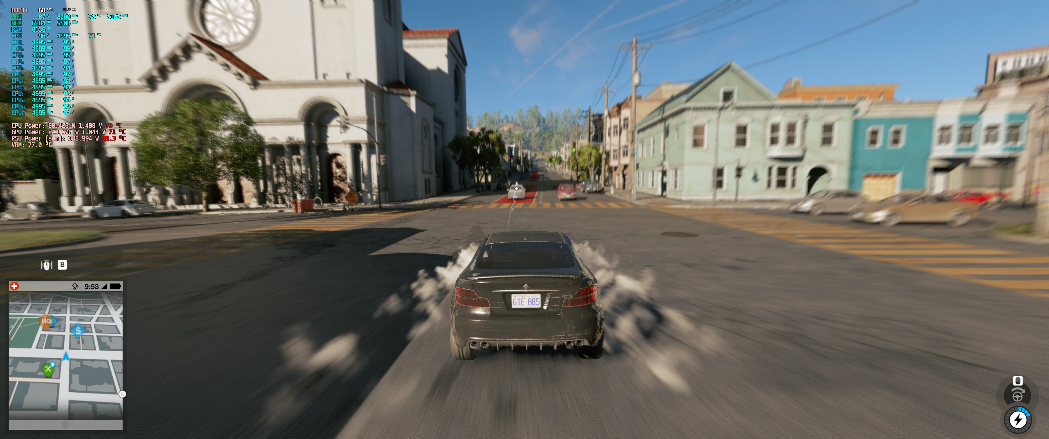 Далее, погонял около часа в процессорозависимой игре Watch Dogs 2, потребление достигало 90w, температура VRM в закрытом корпусе без обдува доходила до 77 граусов, с обдувом задним вентилятором - 71 градус: