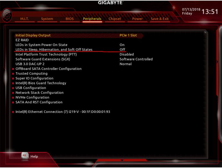 В BIOS выключаем LEDs in Sleep, Hibernation, and Soft Off States
