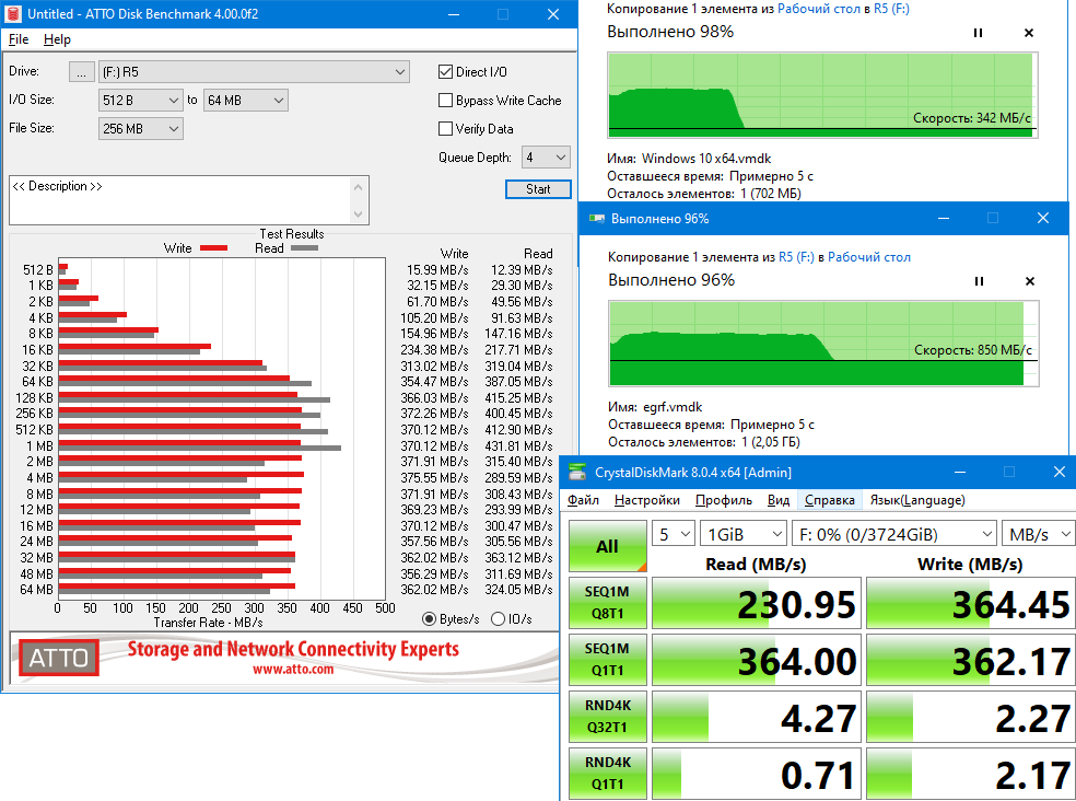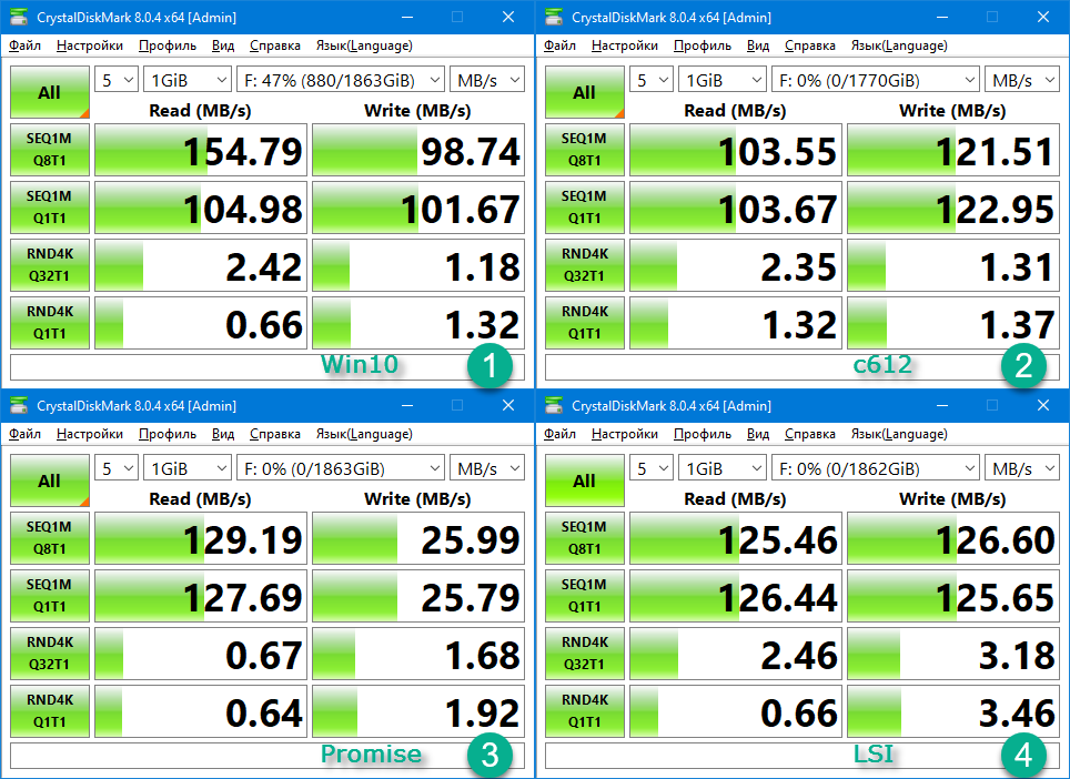 • Raid1 2 диска ---------------------------- 1- массив средствами вин10 2- массив на встройке с612 3- массив на древнем контроллере Promise EX8350 4- массив на менее древнем LSI ------------------------------------------ ATTO