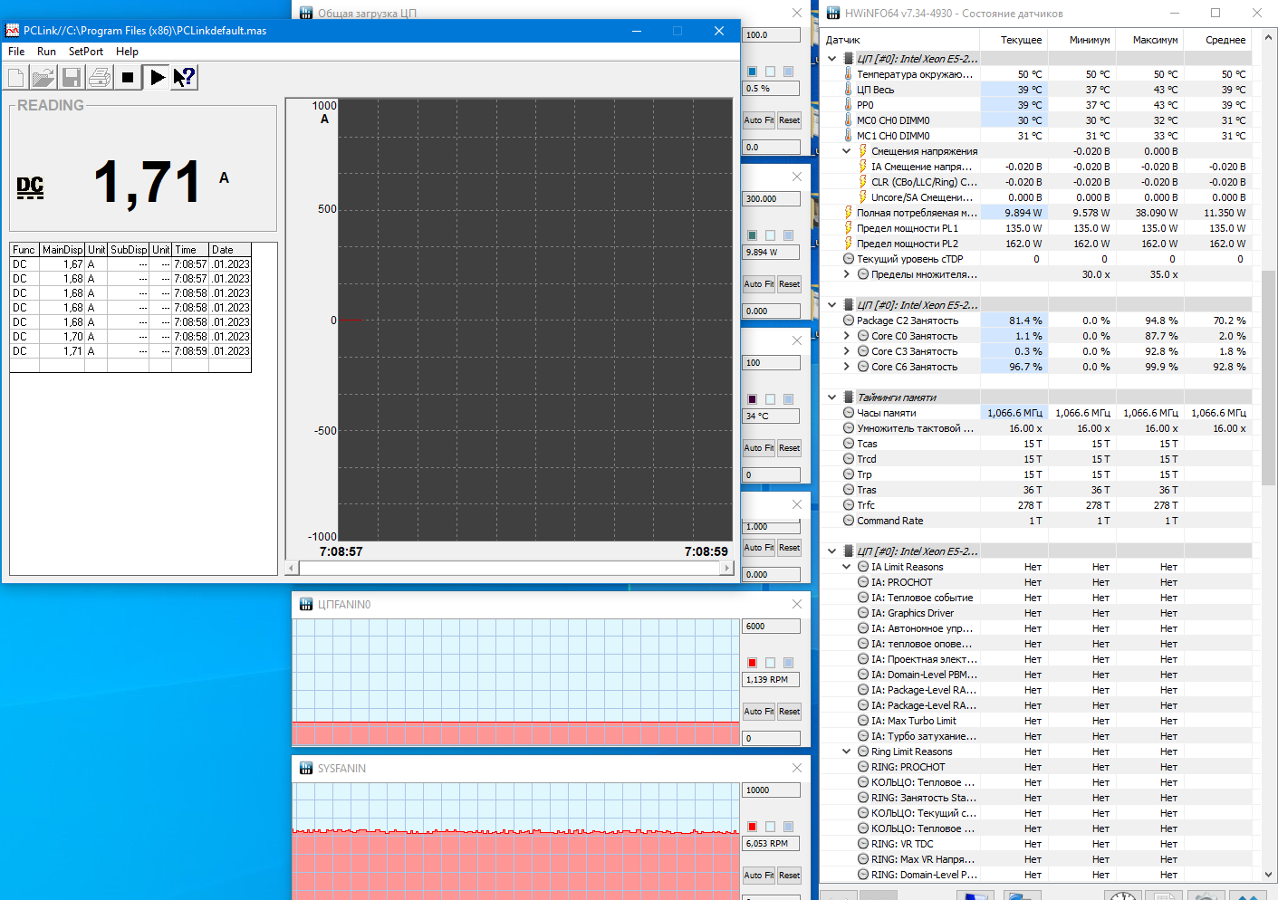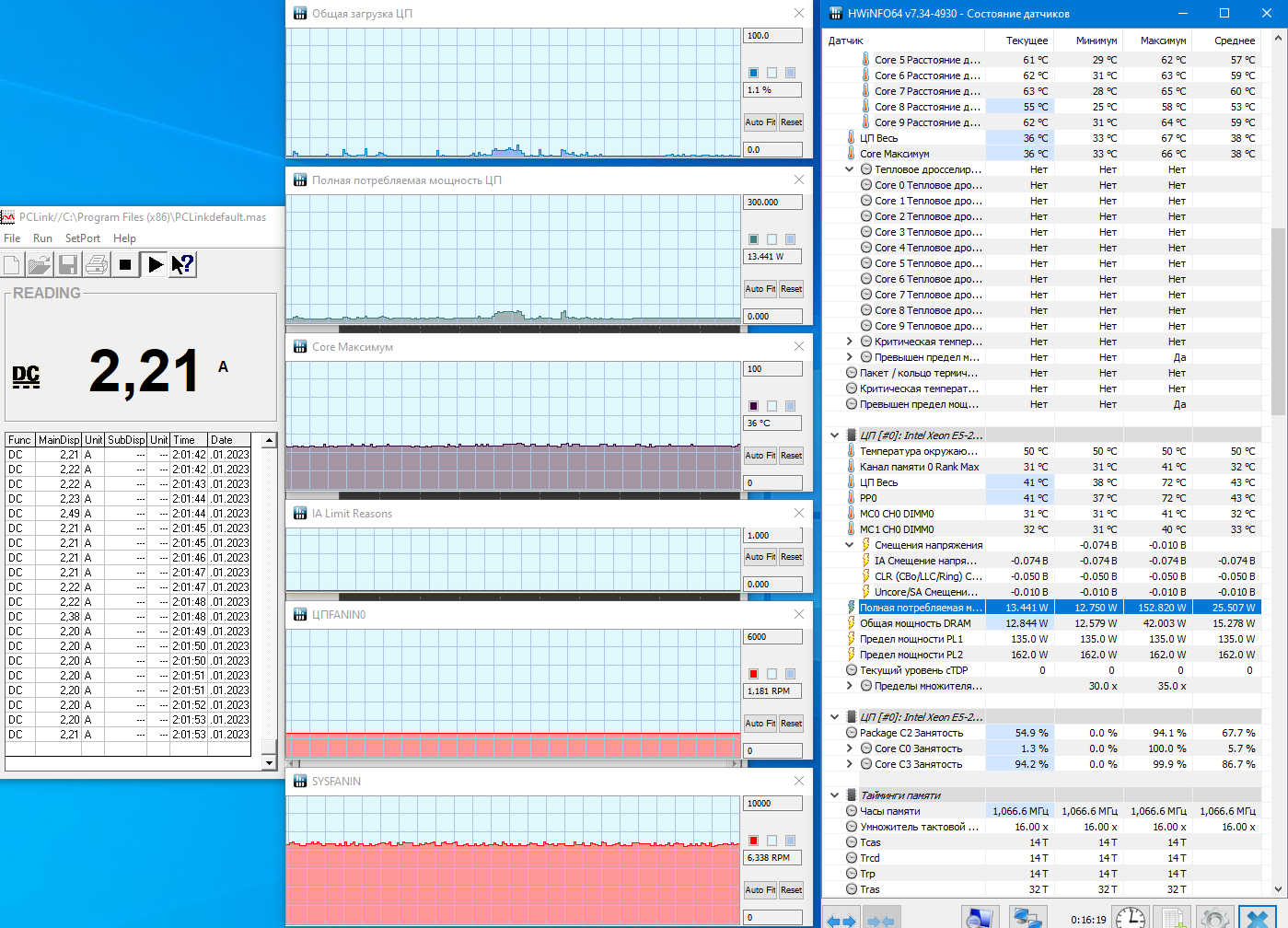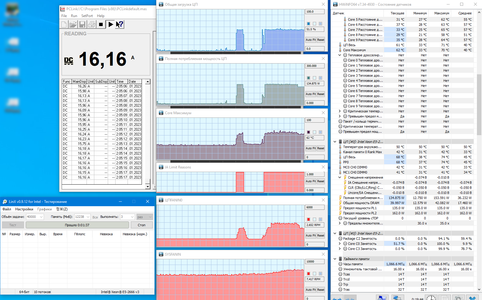 Здесь я сделал ошибку, а обнаружил это уже после установки другого процессора. Работа программы мониторинга тока создает нагрузку и увеличивает потребление процессора в простое на 0,3...0,5А. Итого по "датчику"=9,89 Вт, в реальности около 12...15 Вт.