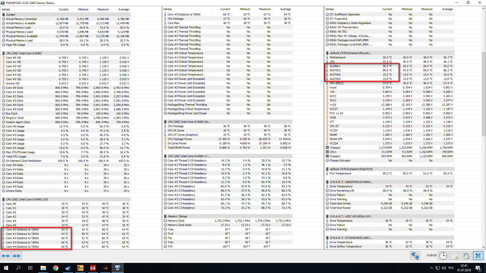 Доброго времени суток, уважаемые. Наконец-то собрал новую систему на интел после 17 лет на амд. Получилось так: i5-8400 (в ближайшей перспективе i5-8600K) ASRock z370 extreme4 bios v.1.80 Corsair 2x8Gb CMK16GX4M2B3466C16 Cooler Master MasterAir MA410P Gigabyte GeForce GTX 1050 Ti G1 (в ближайшей перспективе GTX1066) Kingston UV400 240Gb WD blue 7200 Thermaltake TR2 S 600W У меня возникло несколько вопросов после сборки, сильно не ругайте. 1. Куча непонятных показаний в HWInfo64 типа TjMax и AUX. AUX вообще напугал температурами 98, 103 град. Скрин прилагаю, буду признателен если поясните за них. 2. После включения ПК процессорный кулер стартует судя по звуку на максимальных оборотах, через секунду встает в обороты, выставленные в боисе по температуре. Может я что-то не так сделал? 3. После выключения ПК постоянно горит ярко красный диод - норма или можно отключить? немного напрягает, т.к. ПК полностью не обесточиваю. 4. Драйвера установил по шапке, захожу в Intel Rapid - там абсолютно пусто, ни ССД, ни ХДД моих не видит. Вроде как эта технология должна работать с ССД и рэйд массивами, но у меня в ней пусто...? Устройства подключил в SАТА А1, А2 если не ошибаюсь.