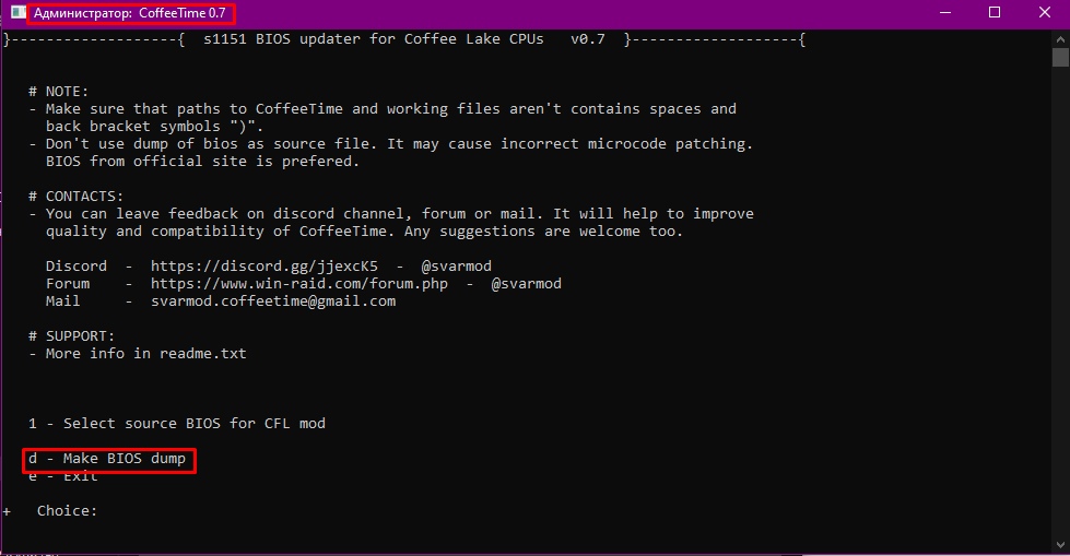 Запустите CoffeeTime.exe. На главной странице указаны особенности использования программы, контакты для обратной связи и предложение прочитать readme.txt для более полного знакомства с функционалом и содержанием версии. Для продолжения работы введите «1» и нажмите Enter. Откроется окно проводника; выберите скачанный с официального сайта биос и нажмите «Открыть». Также можно просто перетащить заводской файл прошивки на CoffeeTime.exe, используя Drag'n'Drop. #77