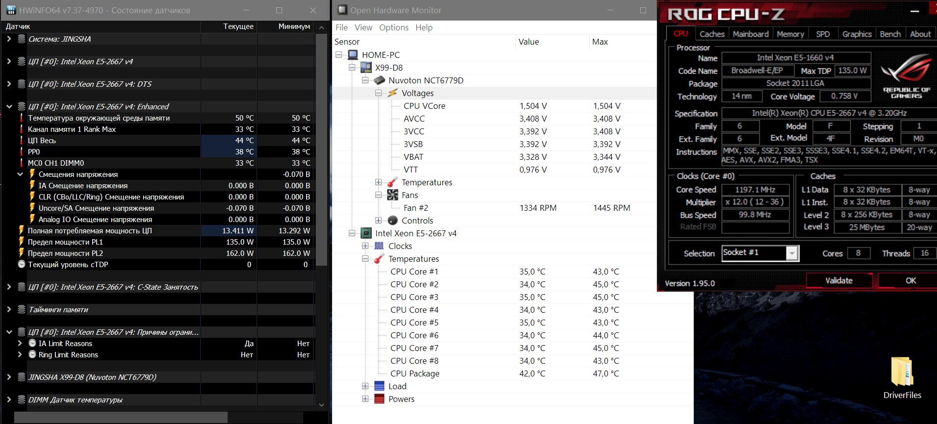 Для разгона множитилем как правило достаточно настроек стокового биоса, но в любом случае не прошивайте биосы предназначеные для анлока турбобуста процессров с заблокированым множителем, типа"с повышенным повер-лимитом и открытыми дополнительными настройками QPI". Для плат Huananzhi и других, использующих схожий биос, нужные настройки находятся в меню IntelRCSetup > Overclocking Feature > Processor и IntelRCSetup > Overclocking Feature > CLR\Ring. Основные параметры: Core Max OC Ratio — множитель ядер. Для Xeon E5 1650 v3 можно сразу установить 41-42. Core Voltage Mode — можно выбрать динамически (Adaptive) повышать напряжение или сделать статическим Core Voltage Override — выставляем напряжение на процессор в милливольтах, к примеру 1250, это будет 1.25 вольта (начать можно как раз с этого значения). Выше 1.30 поднимать с осторожностью! CLR Max OC Ratio — множитель контроллера памяти. По умолчанию равен 30, можно плавно повышать до 33-35 и тестировать производительность и стабильность. Core Voltage Mode — напряжение контроллера памяти. Аналогично Core Voltage Mode, но не выше 1250. Процессоры Haswell очень чувствительны к напряжению контроллера памяти, более-менее оптимальным считается 1.25 вольта, поднимать выше стоит с особой осторожностью.