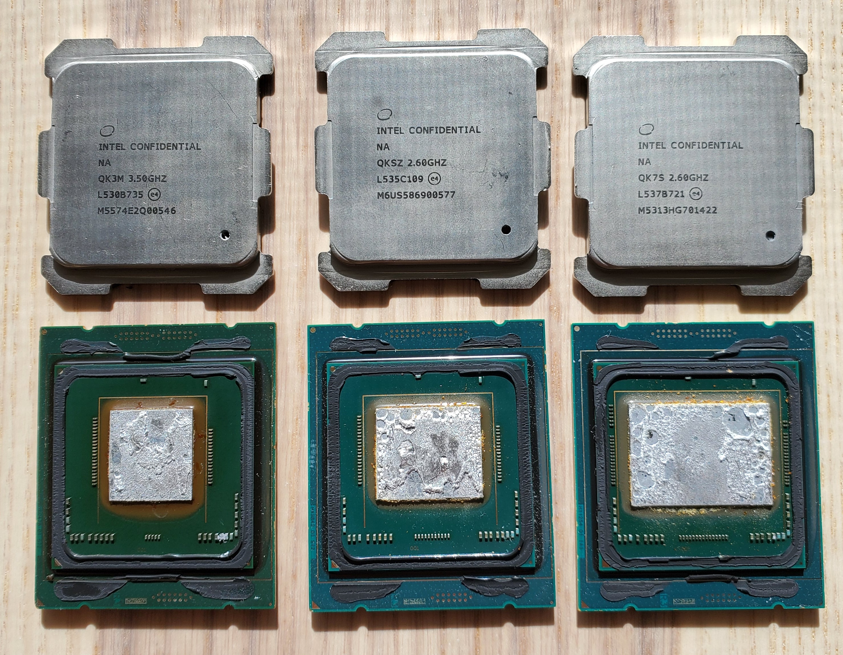 4620 имеет 10 ядер, и большую крышку. 2697 - такую же имеет. 2666 посмотрю попозже. Я слышал, что там припой под крышкой? И нам не грозит фигня, как со старыми Атлонами, у которых приходилось снимать крышку и перемазывать пасту под ней, или просто лепить кулер на кристалл?... Надо понимать, что кристаллы В4 явно меньше и они обошлись одним размером корпуса.