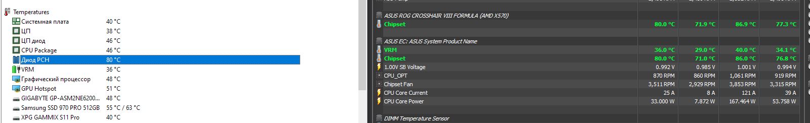 У меня рядом стоит комп с CH8 hero - там прямо сейчас - температура чипсета 64.5, при том что там такая же видяха и охлад чипсета хуже Допускаю что может быть не дожаты болты охлада или говнопрокладки, НО - я не хочу в первый день разбирать мать за 700 баксав.. + у меня была даркхиро - сдохла позавчера (уехала в сервис) - так там вообще - выше 65 почти никогда и не было - и без вертушки совсем