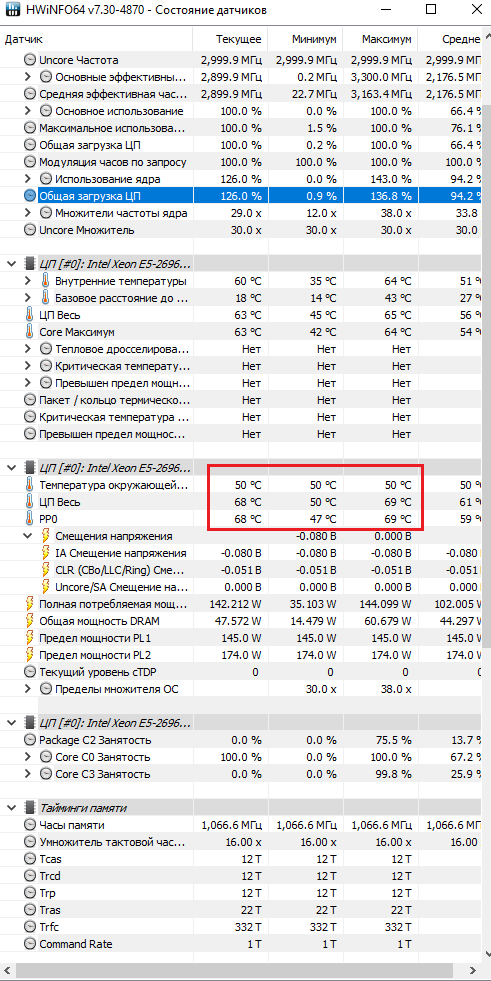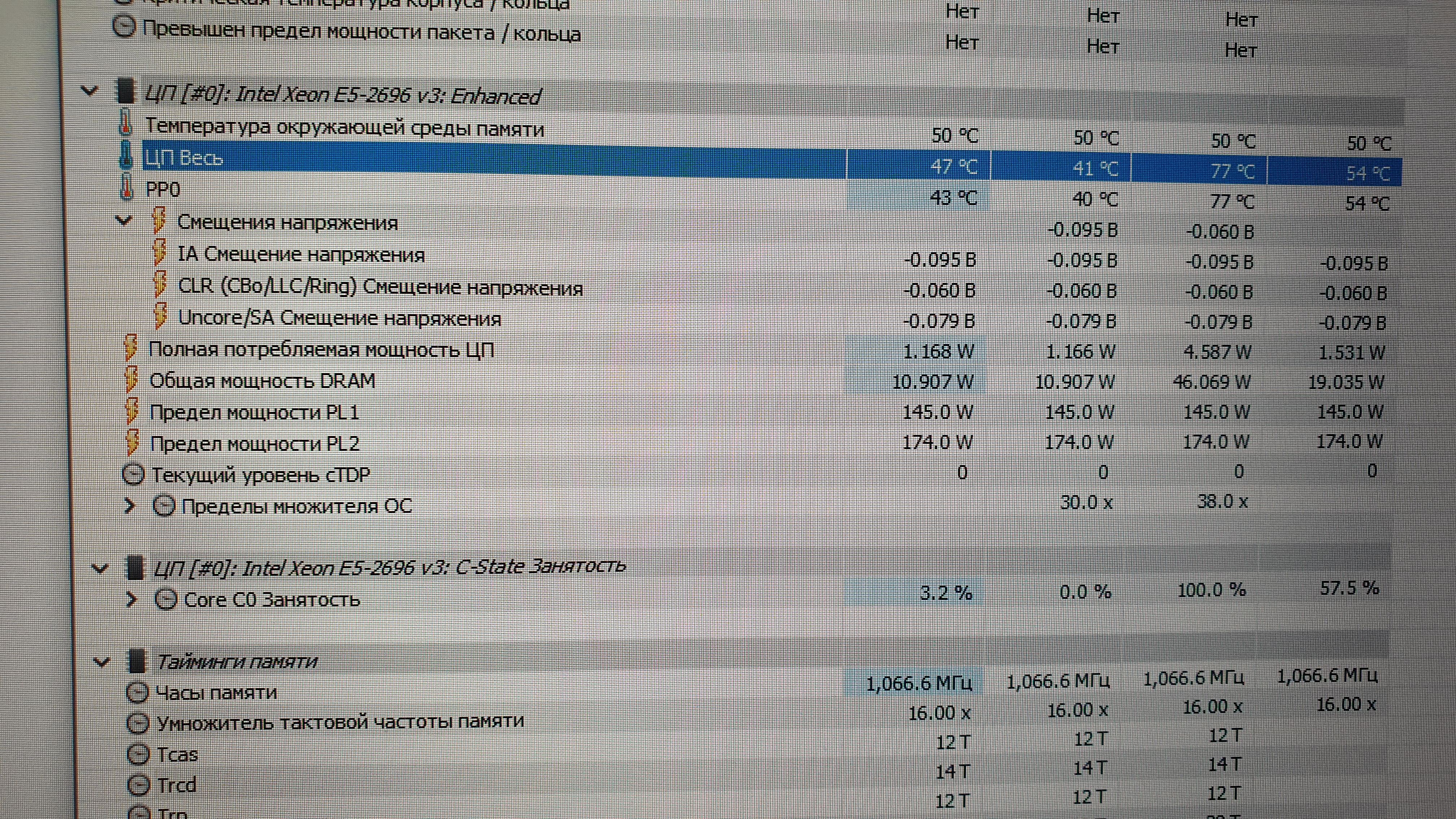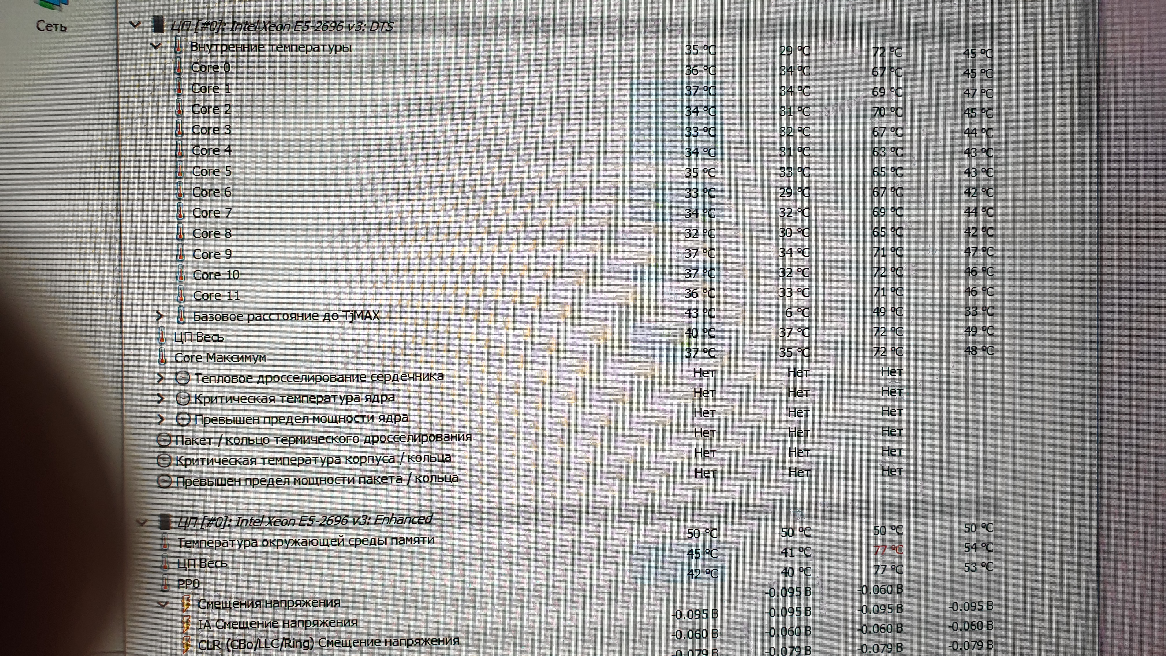 2696v3 -95 -80-60 12/24 может 3.7-3.8. В стресстесте 3.5 стабильно. 14/28 выходит 3.3 стабильно. Жор проца 12/24 при -3.7-3.8 около 360ват в Линксе.... В пике сбрасывает на 3.5. Температура самого горячего ядра 72, весь цп 77.... под nh-d14. Извините, не могу под сполер фото.
