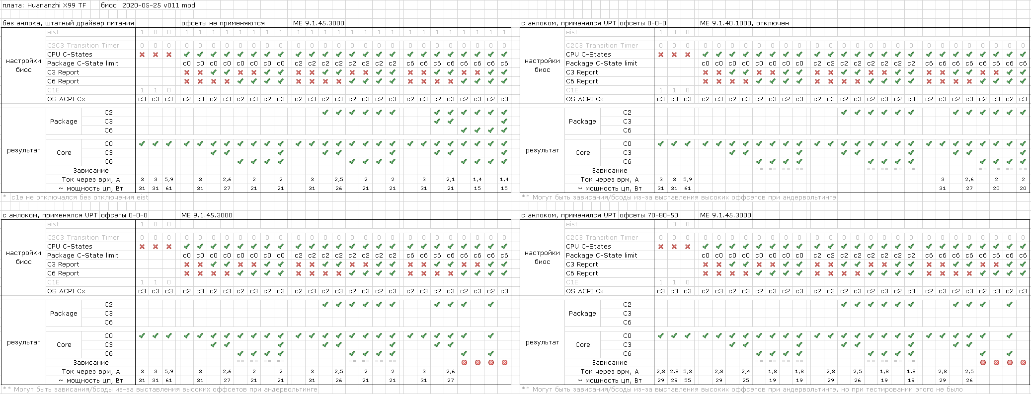 ... На днях минималку тестил, потребление 2696v3 в простое. Самое интересное что при включении C6 Report система не зависала. И OCCT с SSE запускал, и линх с тестмемом, и в простое- система была стабильна. С Package C-States вроде все ясно, при рабочем МЕ и измененном драйвере питания система с С6 виснет, а с ядрами в С6 - виснуть не хочет. И по мониторингу в HWiNFO и по уменьшенному потреблению видно что с6 на ядрах работает. Пока оставил с6 включенным, может со временем зависнет.