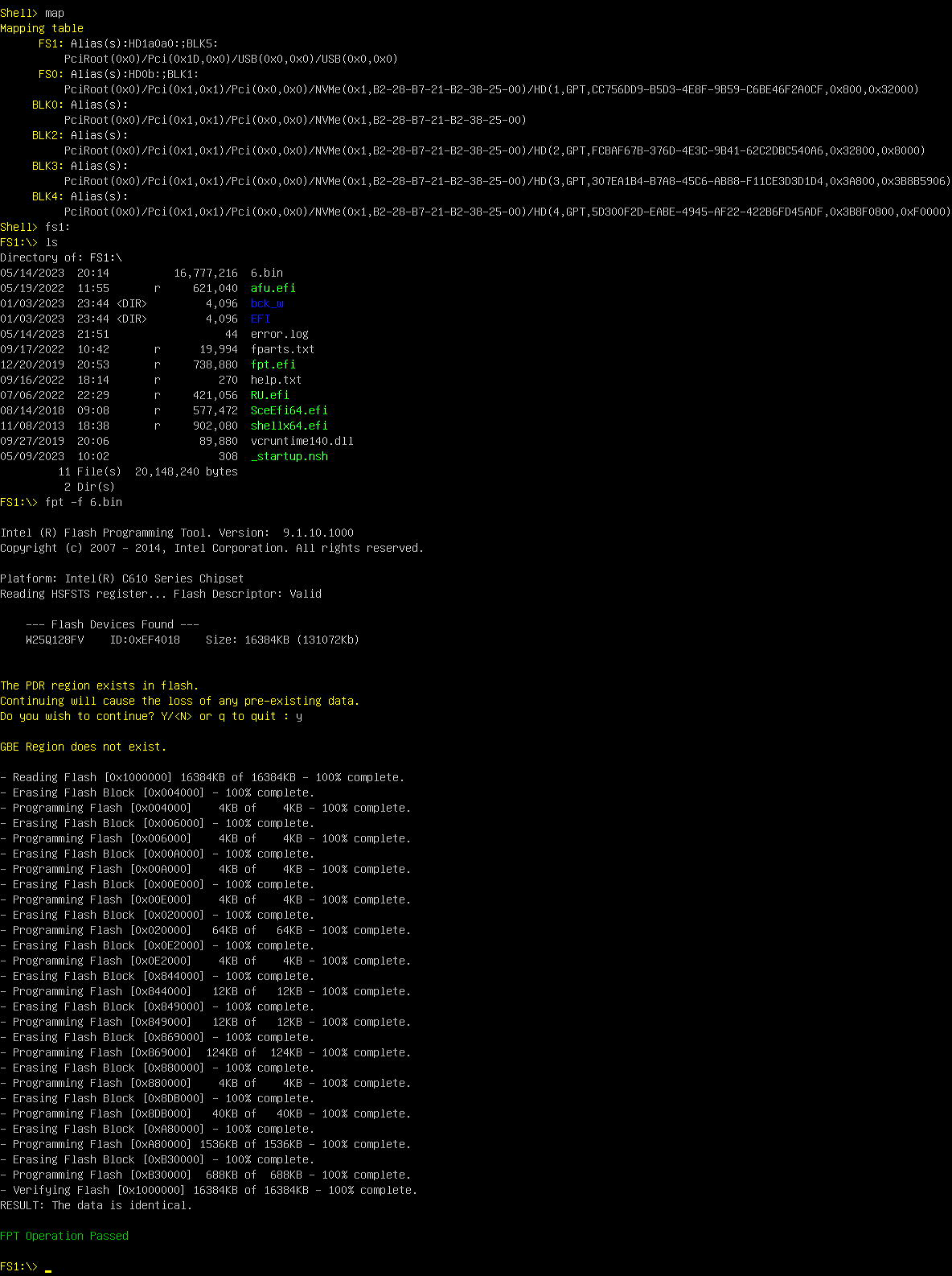 Рекомендуемая программа для прошивки BIOS - FPT, желательно из под DOS, что бы избежать проблем с OS, например, зависания во время прошивки. Можно также использовать программы со встроеным FPT, например, тот же S3TurboTool от ser8989. Касательно AFUDOS и AFUWIN, то рекомендую их использовать только на платах где нет возможности прошить BIOS с помощью FPT, поскольку есть большие сомнение, что они нормально прошивают ME регион на Apito 5 даже с ключем /gan