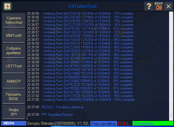 Рекомендуемая программа для прошивки BIOS - FPT, желательно из под DOS, что бы избежать проблем с OS, например, зависания во время прошивки. Можно также использовать программы со встроеным FPT, например, тот же S3TurboTool от ser8989. Касательно AFUDOS и AFUWIN, то рекомендую их использовать только на платах где нет возможности прошить BIOS с помощью FPT, поскольку есть большие сомнение, что они нормально прошивают ME регион на Apito 5 даже с ключем /gan