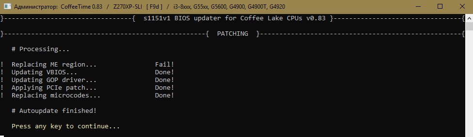 Alexei_Panin Ошибка FPT указывает на неправильное использование параметров запуска в команде. Текущая версия МЕ в вашем случае роли не играет, т.к. на Gigabyte МЕ регион можно без проблем перезаписать - просто прошивайте кофе модбиос целиком. Попробовал модифицировать указанную версию биоса - МЕ меняется абсолютно корректно. Проверьте целостность файлов программы. ES - Engineering sample, инженерные версии процессоров. DualBios - весьма кривая технология, срабатывает не всегда и не на всех платах. Я бы не стал на нее надеяться.