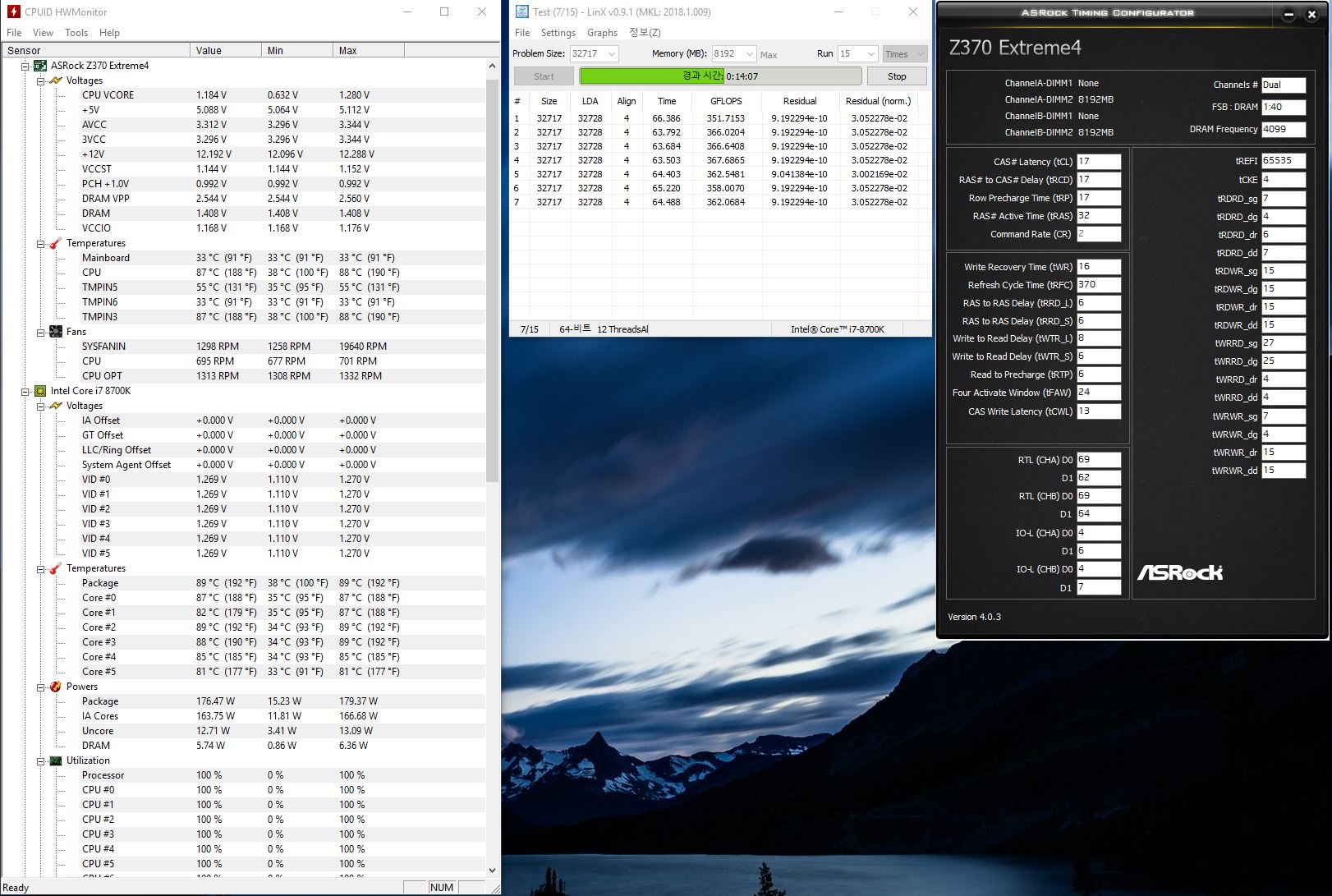 Дома. CPU: Intel Core i5-8600K @ 5300 МГц (AVX 5200), кэш 5000 Мгц, напруга 1.425в MB: AsRock Fatal1ty Z370 Gaming K6 с допаянными low-ESR керамическими кондерами в цепях питания проца и памяти Ram: G.SKILL 3600 16-16-16-36-2T @ 4266 16-17-17-35-2T, 1.515в Video: EVGA GTX 980Ti 06G-P4-4995-KR @ 1480/8500МГц, буст отлажен через биос Охлаждение водой: два 540мм радиатора, шесть 180мм вентиляторов - всё расположено вверху корпуса Thermaltake Core X9 Monitor: LG 31MU97-B 4096x2160