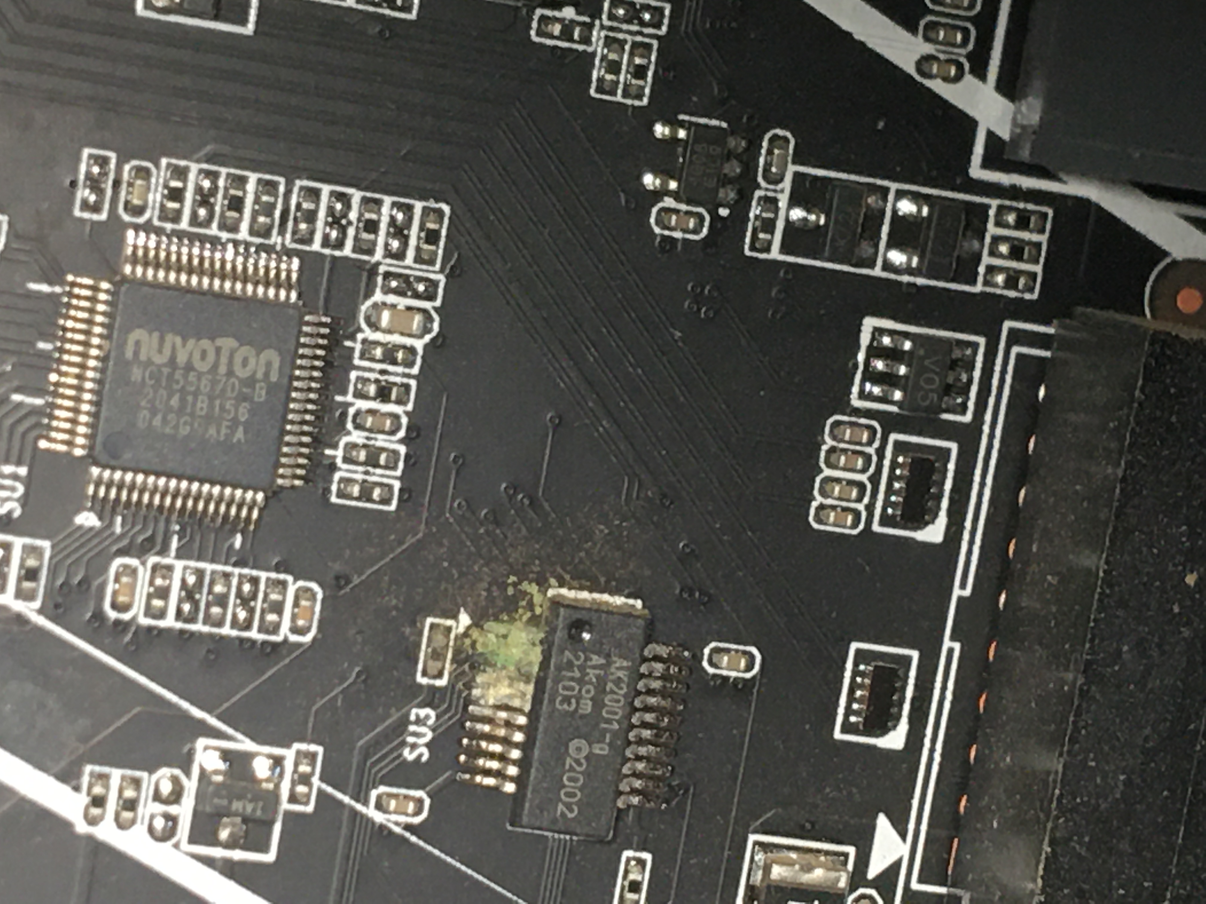 Это Debug port. Именно эта микросхема выводит POST-коды на индикатор. Толи китайцы флюс не отмыли, толи Вы чем-то капнули. Снять мать и отмыть зубной щеткой с изопропиловым спиртом, пока коррозия не забралась под маску и дорожки не съела.