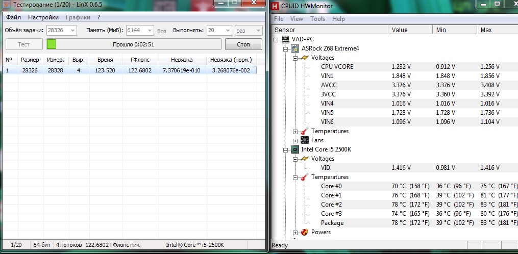 Всем привет, вот выложу свои скриншоты касательно разогнанного I5 2500k до 4.5ГГц разгонял не сам поэтому в этом не силён, однако скриншоты могут быть кому то полезны(В таком режиме пк уже 1.5 года, линпак проходил без проблем(LinX 0.6.4 AVX (Linpack 10.3.10.017)))