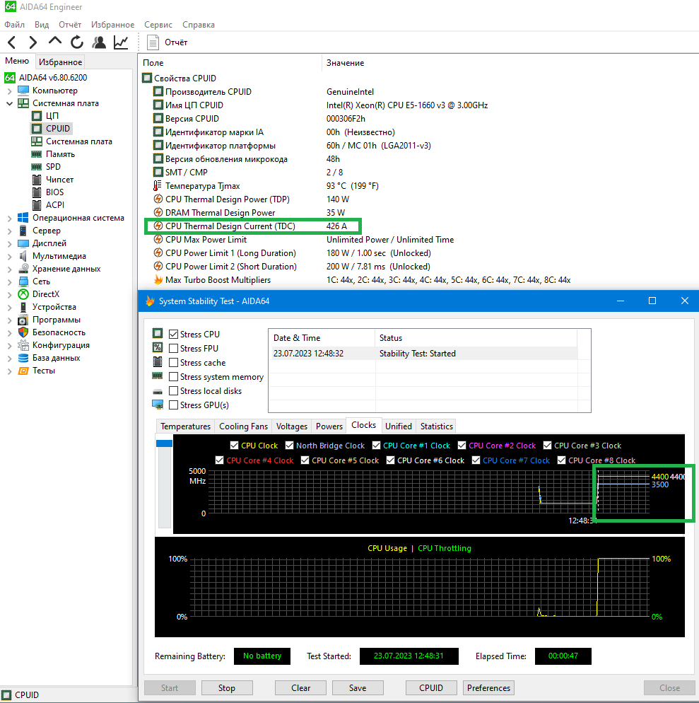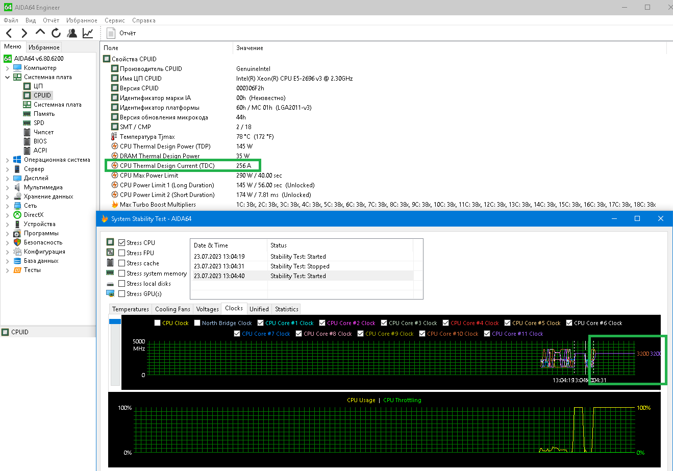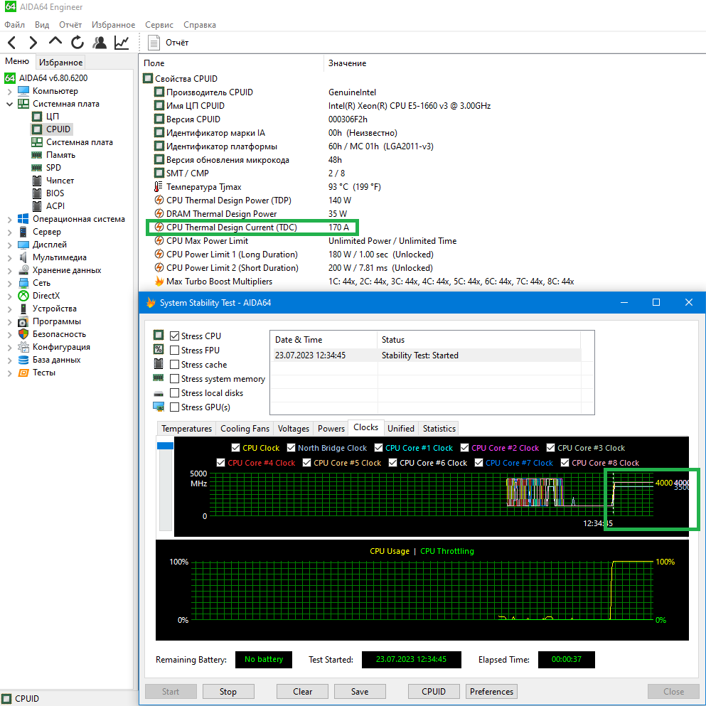 поставил Intel Extreme Tuning Utility и убедился, что вы правы, проц упирается то в TDP 145/174W, то в EDP (176A) при разных режимах нагружения. 176А не удается увеличить - изменение не принимаются, это норма для процессоров v3, другого варианта обойти ограничение нет?