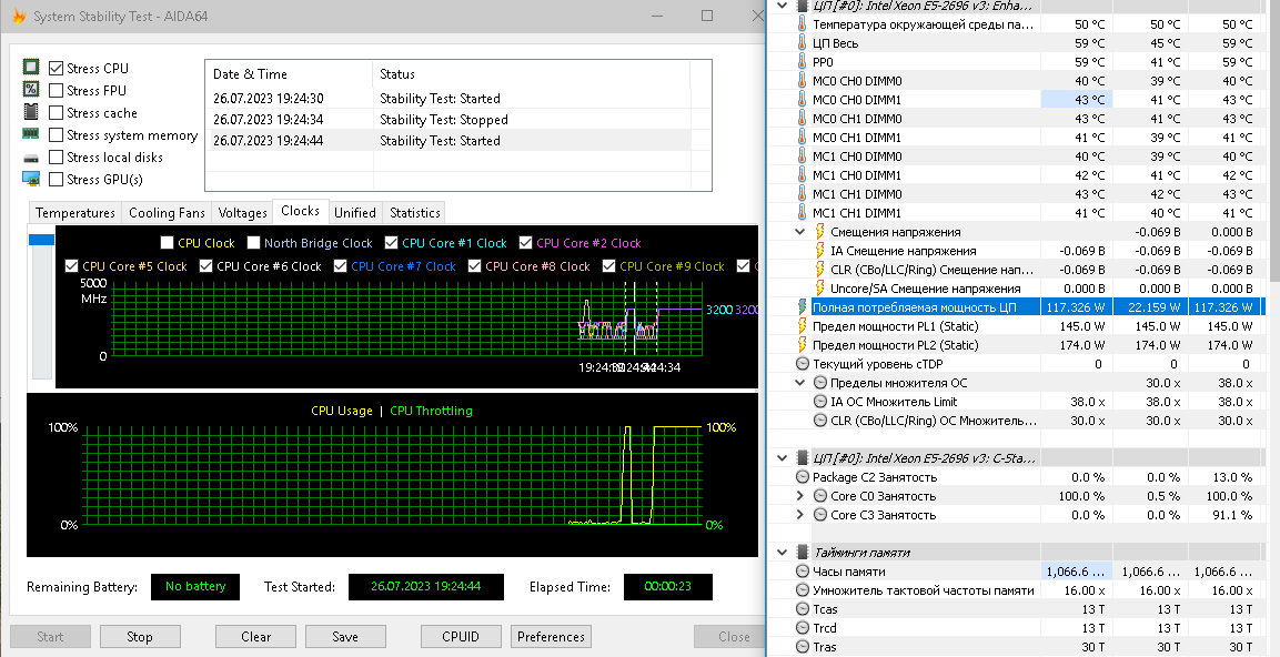 Плата F8, версия не указана, на текстолите маркировка 16 неделя 23 год. Купил новую на али во время распродажи в мае 23 (уж очень цена хорошая была). Биос GHX99015RU 2020-05-25, анлок, пропатчен UPT. Андервольт -70 / -70 / 0, без бага фивр. PL1/PL2 по дефолту, время превышения PL1= 56 сек, установка уровня TDP отключена. Ток по дефолту, выставление 256А на результат не влияло. Включены все 18 ядер, НТ включен. Включены энергосберегайки РС2/СС3. Аппаратная координация Р-состояний, единый домен по питанию отключен. Настройка энергоэффективности -> включено (контроль ос) профиль электропитания в винде- сбалансированная производительность, мин 20%, макс 100%, парковку ядер не использую. DDR4 8x32ГБ на частоте 2133, тайминги ужаты 13-13-13-30 Никакого разгона по шине естественно нет, но шина ровно 100 МГц.