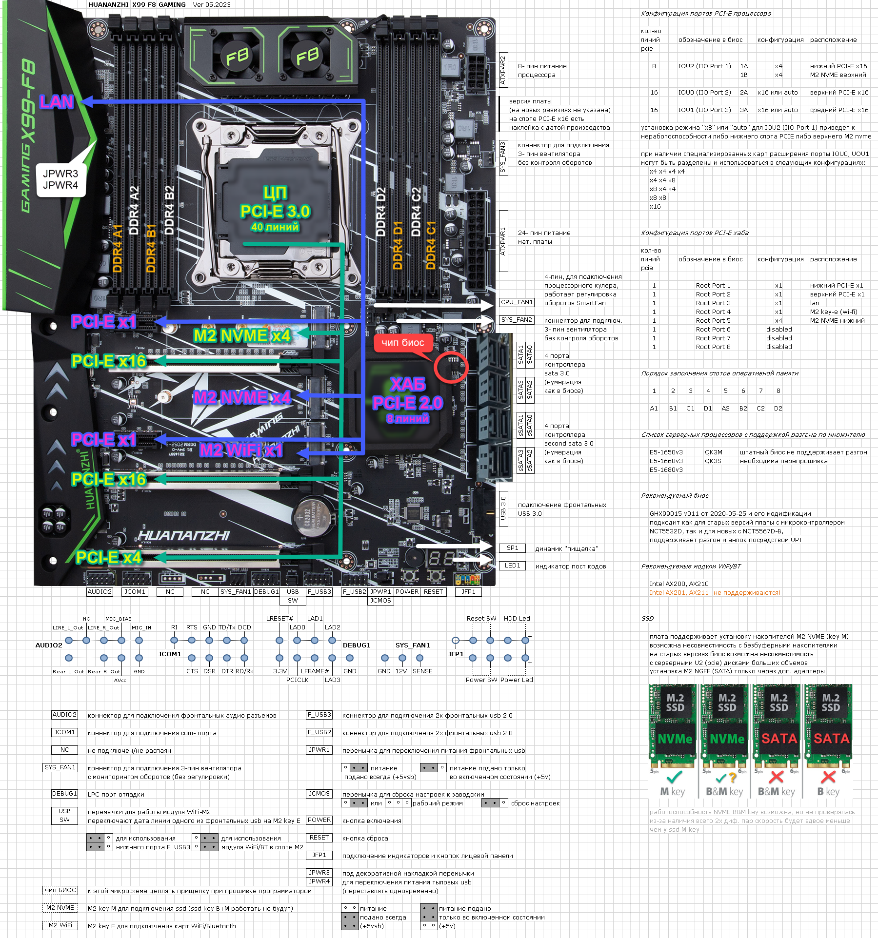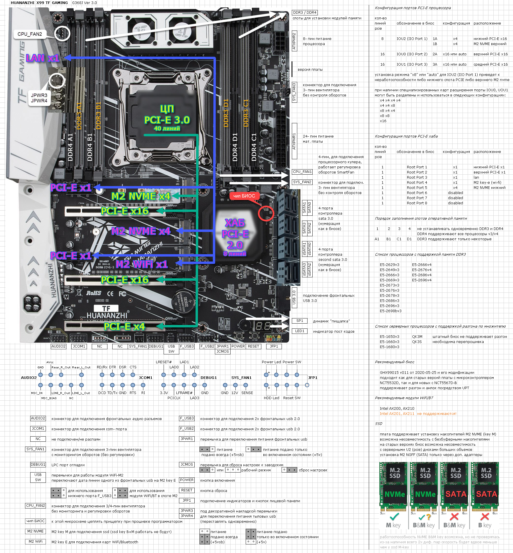 Внимание материнские платы x99-tf, x99-f8 и x99-t8 поддерживают работу только с m.2 nvme. M.2 SATA работать не будут!!! Также платы поддерживают m.2 wi-fi или стандартный pci-e wi-fi, ноутбучные mini pci-e будут работать только через соответствующий переходник!!!