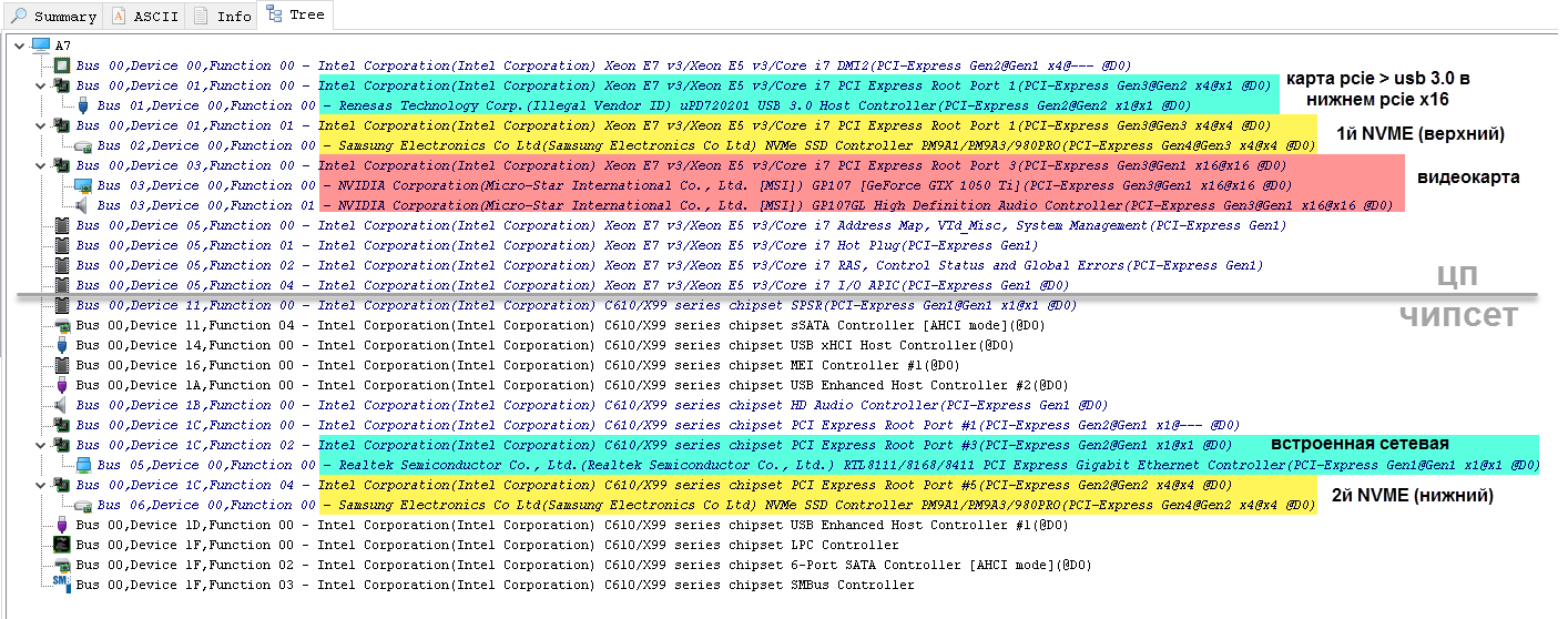 Сейчас у меня установлено: в верхнем NVME- системный диск, в нижнем PCIEx16 плата расширения (pcie > usb 3.0), в среднем PCIEx16 видеокарта. Второй (нижний) NVME и встроенная сетевая подключены к хабу.
