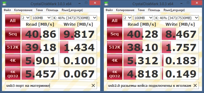 некоторые образцы (ваш, например) вполне могут уложиться в предельные для USB2 40-45МБ/с. Хотелось бы всё-таки увидеть скрин CrustalDiskMark со скоростями на линейных операциях.
