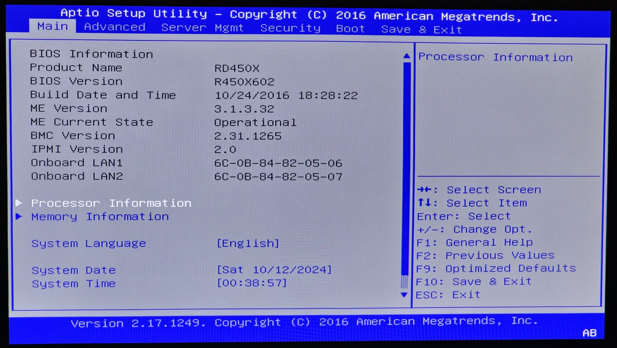 BIOS Version R450X218 10/27/2016 ME version 3.1.3.32 BMC Version 2.36.1315 IPMI 2.0