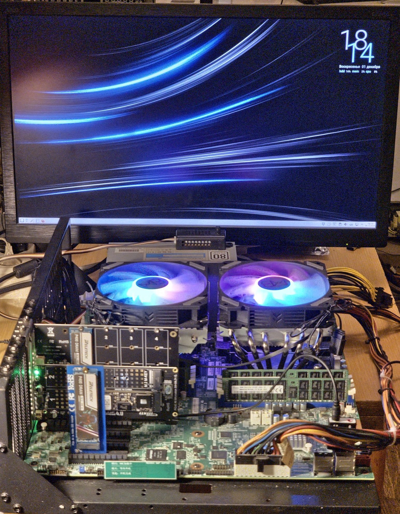 upd По корпусу хотел еще добавить, так как обдув процессоров идет вверх, то поставил два 120мм вентилятора вверх на выдув и один 120мм на вдув в самом низу.