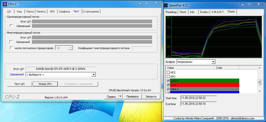Всем привет!!! Перепрошил зеленую хуанан версия: 2.29, дата биоса: 06-26-2017, южный мост: с206. Перепрошивал на сайте "http://x79.apphb.com/mb/" следующим биосом: rev2.49 c204 Cpu & Ram patch 06-28-2017 14-19-20. Получилось прошить только через афудос, фпт выдает ошибку региона. Все отлично работает. У меня стоит кулер DeepCool GAMMAXX S40 (125 Вт). Разогнал до 4.4.ГГц, но в CPU-z процессор сбрасывает частоты через несколько секунд до 4.3. Если подождать минуты две, то процессор сбрасывает частоту до 4,1 ГГц. Температуры подскакивают аж до 80!!! Похоже частоты сбрасываются из-за сильного нагрева, придется брать хороший кулер на 6-ти трубках. Хочу купить DeepCool LUCIFER K2 или DeepCool NEPTWIN v2. Как думаете хороший выбор? Подскажите, что лучше взять? Ниже тесты в CPU-z е-1650 (4.3 ГГц и 4.4 ГГц)