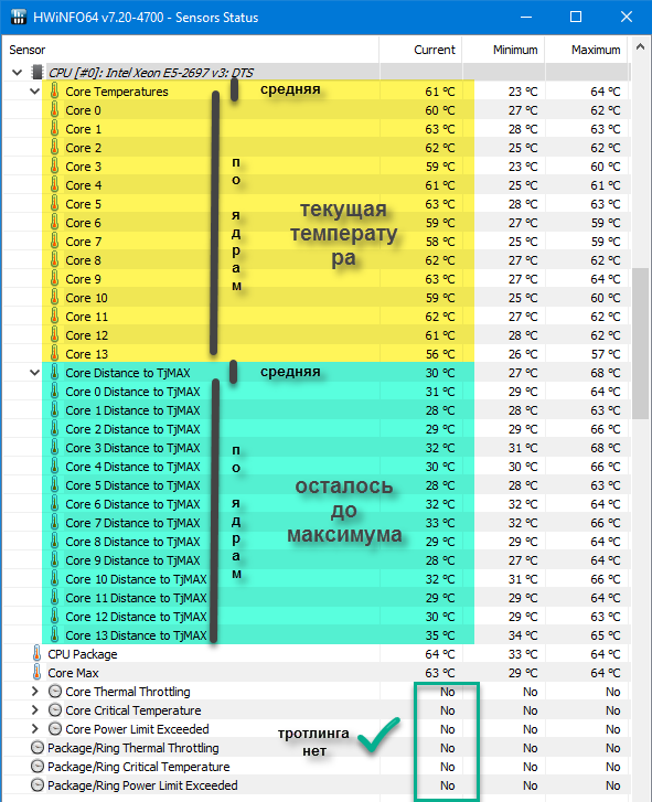Начало троттлинга зависит от температуры ядер. У 2696v3 (с анлоком) макс. 78° Температура процессора по PECI (температура, отображаемая в биос) влияет на работу смартфана. Эта температура может калиброваться в биос параметром Tbase0. У меня для 2696v3 установлено 16 (занизить на 16°). Калибровал "на глаз" по температуре самого горячего ядра.