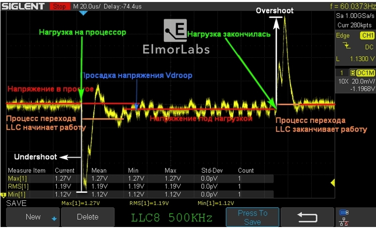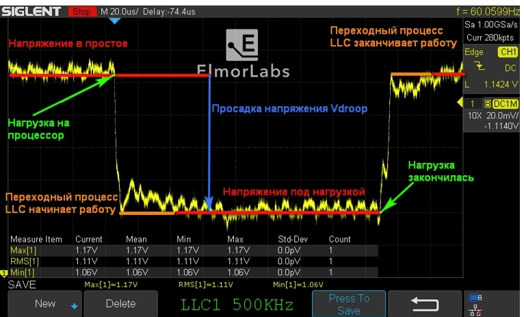 На этот счет есть статья - "Как уменьшить количество и размер выходных конденсаторов в схемах блоков питания" https://www.electronicdesign.com/power- ... ly-designs, где в одном из разделов рассматривается работа Adaptive Voltage Positioning. И во многих статьях по AVP кроме улучшения переходных характеристик так же упоминается возможность уменьшения общей емкости банка конденсаторов, что уменьшает стоимость VRM. Давай по простому, на пальцах...чем обусловлен Vdroop при увеличении тока? Ведь любой, самый дохлый VRM способен мгновенно поднять напряжение хоть до предельной величины (в нашем случае до 1.55V. Поэтому мощность VRM определяется отдаваемым током, а не напряжением). Однако VRM не беспокоится по поводу Vdroop на протяжении всего периода увеличенной нагрузки. То есть это понижение напряжения намеренное. Полно людей, которые пытаются эту "просадку" выровнять с помощью LLC - при этом происходит вот это