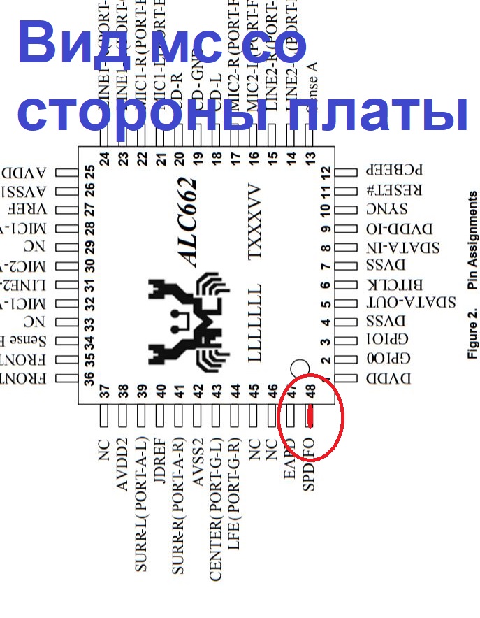 или инструкция по "допиливанию" HUANAN X79 v2.49 для полноценной работы SPDIF (Optical variant) Что понадобится: 1. Оптический разъем SPDIF (можно выпаять из ненужной материнки). Внимание! Перед тем как выпаивать, узнайте распиновку. Я узнал так: 1 щуп на массу, вторым тыкаю по очереди на 3 контакта, который звонится - тот масса (земля), далее один щуп на ближайший USB ( пин +5В), второй по очереди на оставшиеся 2 пина - на которой будет падение в районе 500мв - тот и +5В. На оставшемся пине будет бесконечность (это сигнальный, clocta). 2. Паяльник и прямые руки. Начнем: Отпаиваем и приподнимаем 48 пин мс alc662 или аккуратно перерезаем дорожку рядом с ним, так как дальше она уходит на резюки (их то выпаять не проблема), а проблема в том что она так же меж слоями уходит на рядом стоящую мс nuvoton, резать очень аккуратно чтобы не повредить межслойные дорожки. Далее подпаиваем проводок к 48му пину мс alc662 и при желании усиливаем место пайки на герметик или термоклей. Этот проводок и будет наша clocta. Далее на предыдущих страничках уже было сказано и показано где поблизости взять 5В и землю. Припаиваем к разъему и радуемся. Теперь о нюансах (он 1 в моем случае). После данной доработки у меня музыка появлялась на 20-30 сек и затем пропадала наглухо пока не "передернешь" +5В. Долго, долго голову ломал, ставил всякие резюки и кондеры в разрыв клокты, ничего не помогало. В итоге на второй день со свежими мыслями обнаружил что при подключении к разъему +5В красный диод на секунду горел чуть ярче (именно в момент включения). Экспериментально нашел полу-дохлую батарейку (на ней было около 900Мв) и подкинул в разрыв по питанию, итог - теперь музыка не выключается и играет стабильно. Возможно это специфика моего разъема, буду мутить линейный стабик чтобы с молекса с 12 понизить до 6 вольт. Так же проверил звук 5.1 - работает шикарно! Вот так ребята бывает когда ну ооочень не хотелось покупать отдельно звуковуху. Всем спасибо за внимание!