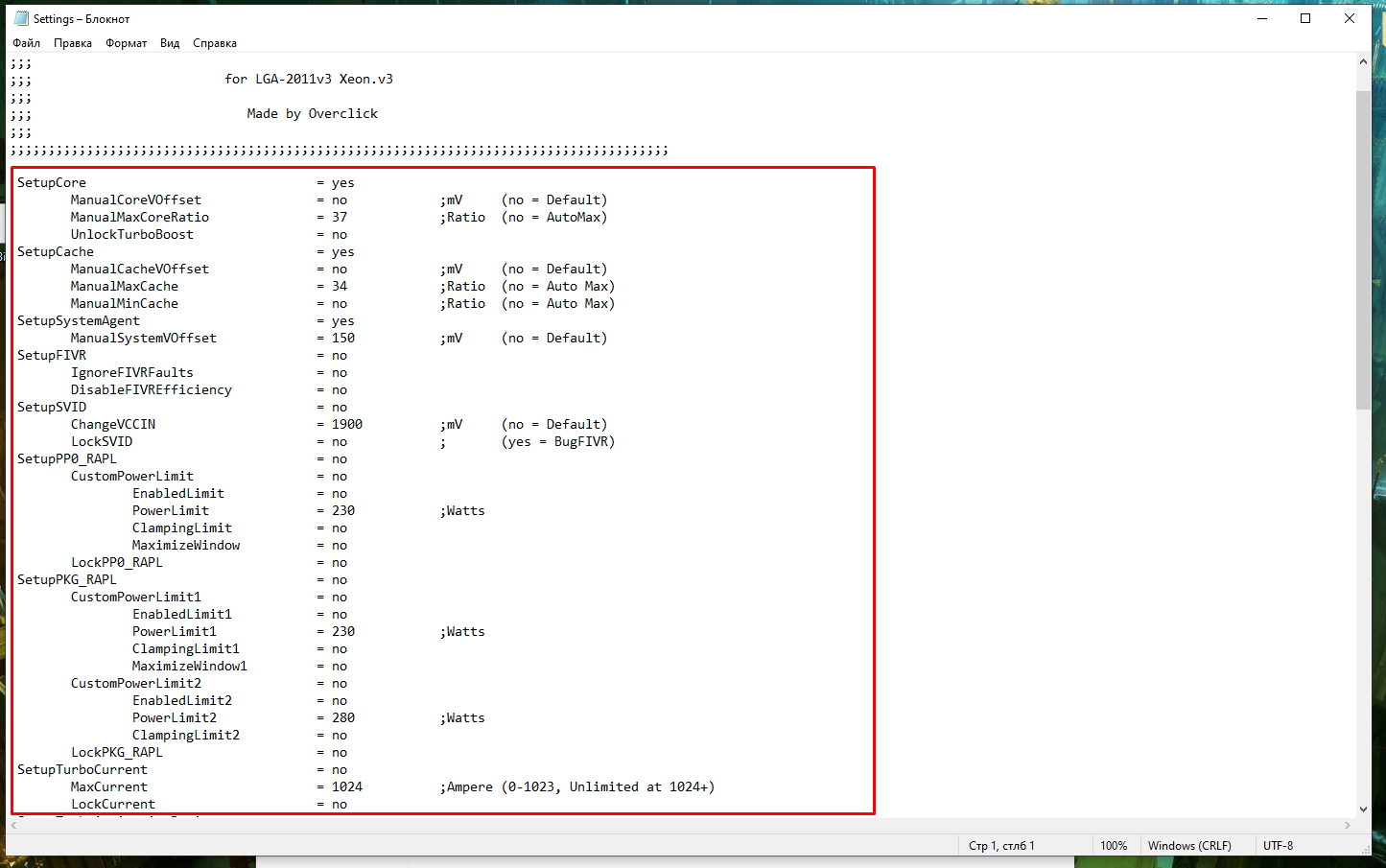 Matsuda Можете попробовать моим патчером (RAW драйвер). Он применяет и блокирует от перезаписи настройки множителя и прочего до загрузки биоса как такового. Применить патчер можно без возни с файлами прошивок прямо на мамку. Он аккуратно считает загрузочный (Early Boot) участок биоса, добавит драйвер и зашьет этот кусочек обратно в мать. На всё про всё две секунды, потом достаточно усыпить и разбудить комп для результата. Какой у вас при этом биос на мамке, патчеру фиолетово, мой драйвер в любом случае будет отрабатывать первым, главное чтобы биос регион был разблокирован на перезапись. Также легким движением руки, драйвер можно убрать за две секунды, ну или убрать ранее установленный, забагованный RAW драйвер от s3TurboTool. Для избежания конфузов и несовместимостей некоторых настроек с вашим конкретным процессором, ведь патчер заточен под мой Xeon v3, желательно в файле Settings.txt отключить все подразделы и уже потом включать их по мере необходимости. https://www.overclock.net/threads/xeon-e5-2699-v3-e5-2696-v3.1799353/page-7 Последняя версия где-то на шестой странице залита, найдете.