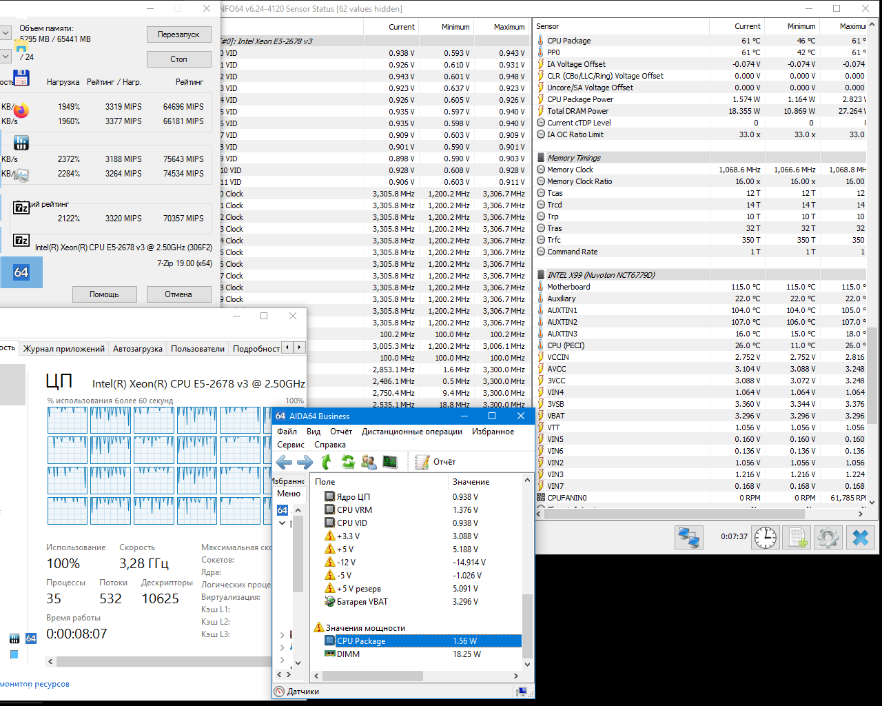 Запущен benchmark 7Zip Обратите внимание на пункты: "CPU Package Power" - 1W вместо ~120W "CPU VRM" - Aida показывает 1.375V , а HWinfo показывает VCCIN = 2.752V (хотя реальное значение конечно 1.4V)