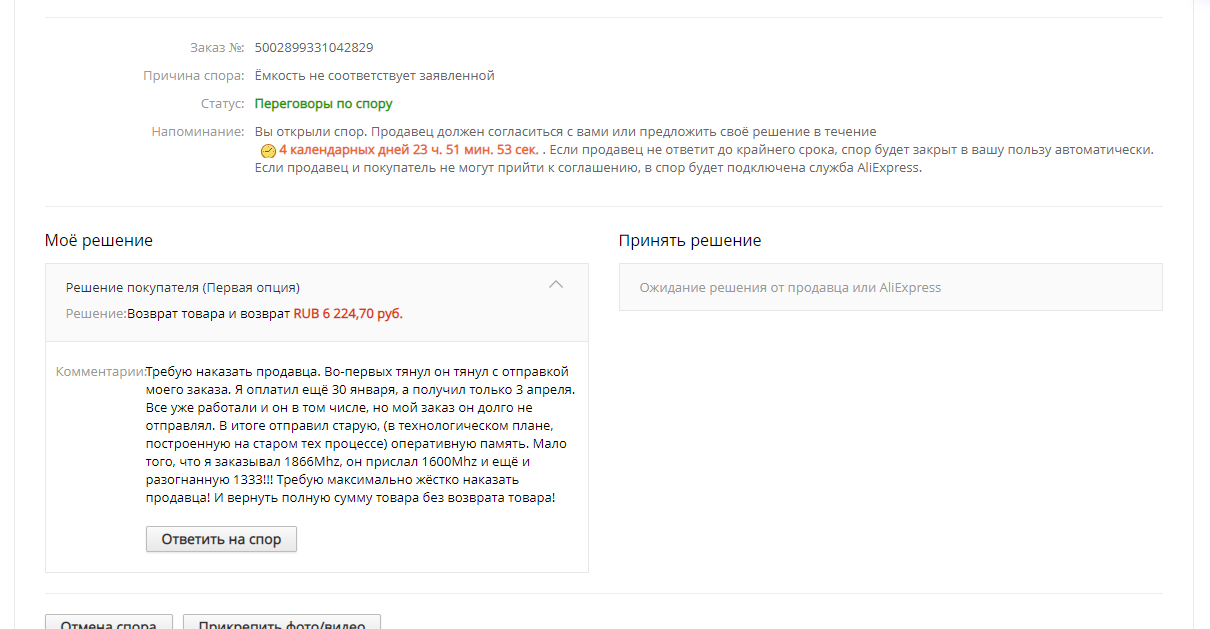 Вобщем открыл спор предоставив скриншоты на полный возврат средств без возврата товара. Правда я обращался в ТП и думал что текст буду им писать, а меня перенаправили к продавцу.