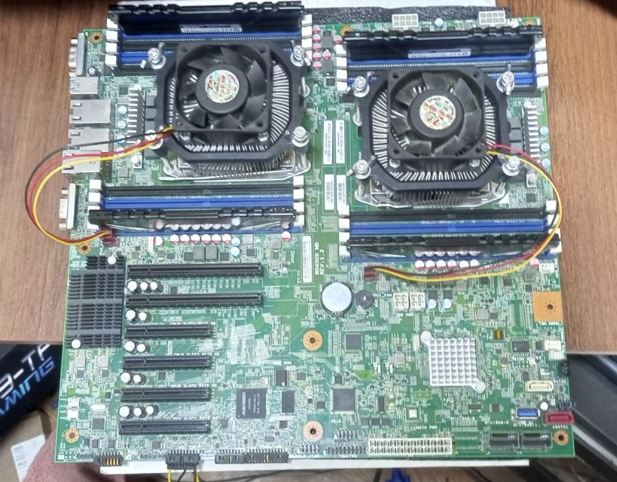 PPPS (описание охлада): радиаторы от боксовых кульуов интелл 775 (вентиляторы сняты т.к. невозможно их закрепить на сокете нарров). Вентиляторы от кульков термалтейк вулкан Cu6 (5500 rpm). Всё собрано воедино и через переходное "кольцо" на нарров. Вывод: непроемлемо (лучше использовать чистый люмин). Хотя... если в bmc удасться настроить обороты и температуру, то...