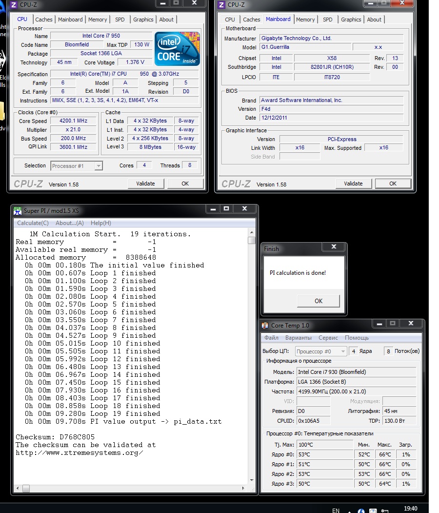 CPU ratio - 19 Intel SpeedSteep Tech - dis BCLK - 201 PCIE - 100 DRAM - 1611 VCLK - 3224 Qpi Link Data Rate - 7254 DRAM timig - 6-7-6-20-1t