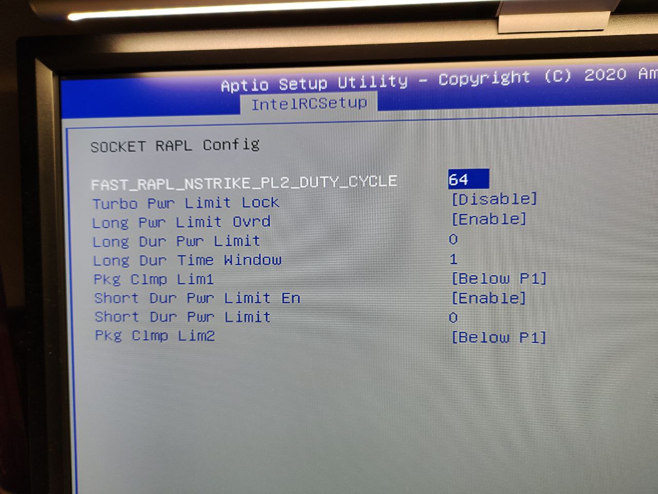 Лимиты PL1 (Long Pwr Limit) и PL2 (Short Pwr Limit) в биосе на залоченных процессорах или не работают или работают только на уменьшение. Можно поставить в обеих строках 32767, но процессор (2696v3) все равно будет работать на своих лимитах. С незалоченным 1660v3 настройки лимитов можно менять в обе стороны. Параметр установки времени превышения (Long Dur Time Window) работает везде, цп сможет превышать PL1(ТДП) на максимум 56 секунд.