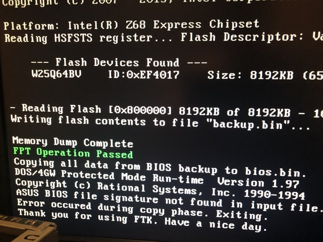 Добавлено спустя 9 минут 32 секунды: Итак, замкнув аудиочип, чтобы получить доступ к записи, я загружаюсь в флешки (на которой лежит последний биос с сайта асрок, переименованный в bios.bin) в freedos, c помощью FTK и команды biosrefl я его прошиваю. Проходит все без ошибок. Он должен принудительно прошить и Intel ME. Ничего не меняется. Что я делаю не так? UPD оказалось, что FTK не прошивает асроковские биосы. Первая и последняя карта от этой замечательной фирмы. Всем спасибо.