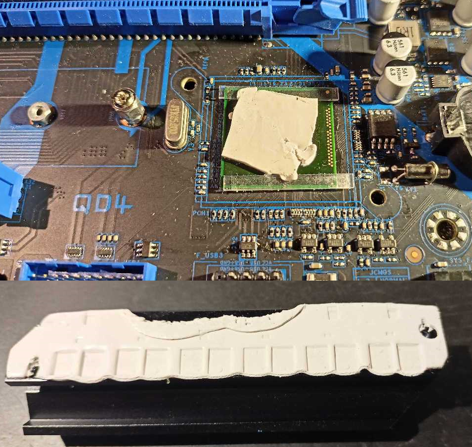 Радиатор врм как-то еще прижимался, а вот радиатор чипсета почти не касался кристалла.