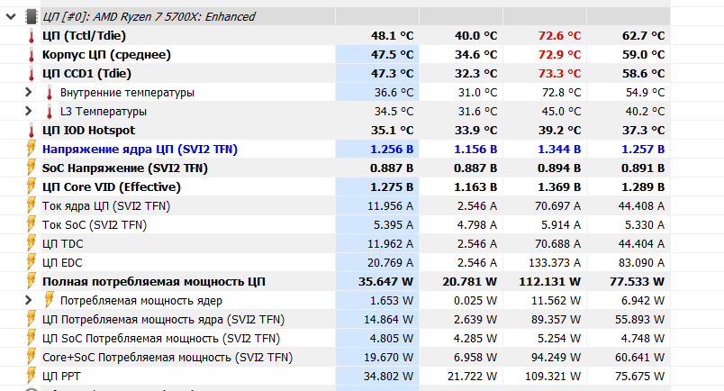 Нетрудно видеть, что 5700Х жрёт не так много даже с отпущенными лимитами (у меня там 150/150/150, что заведомо больше потребляемого) и если материнка сможет в PBO и процессор осилит "-25", то в-принципе, проблем быть не должно по питанию.