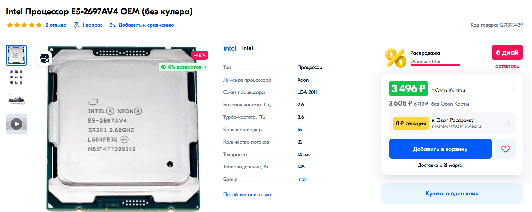 2.VEugene Продаю комплект вот такой: https://aliexpress.ru/item/100500314818 ... 1667062299 Только камни 2666 v3 Состав: HUANANZHI X99-F8D LGA2011-3 Xeon E5 2666 v3 - 2 шт. Кулера для CPU - 2 шт. 8G DDR4 2133 REG ECC память - 2 шт. 128G M.2 NVMe SSD (китайский) - 1 шт. Комплект был запасной, куплен целиком мной лично, заменены в нем только камни (изначально были 2690 v3) Все проверено, запускается. Цена 22000 руб. В Москве.