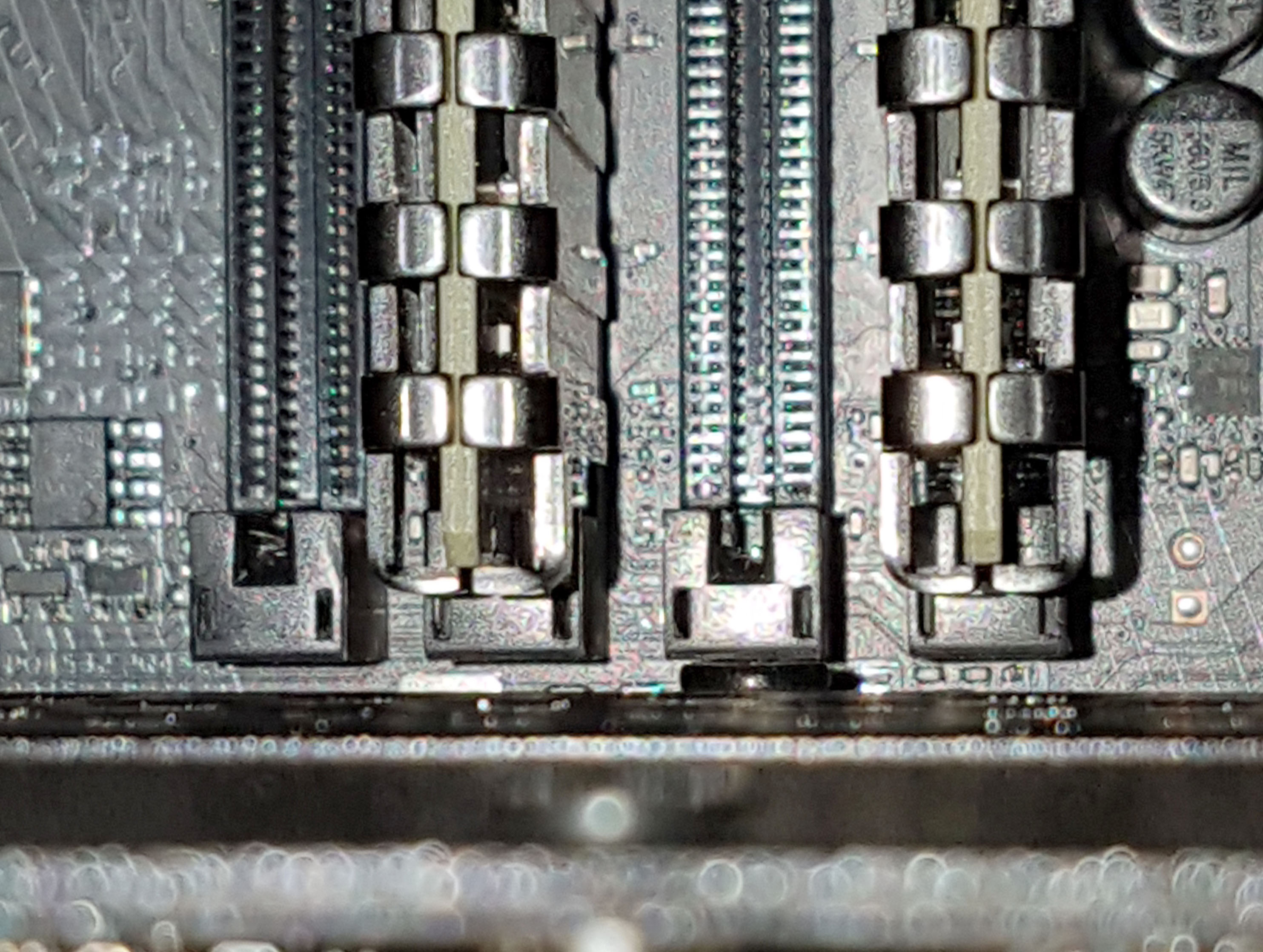 Разъемы DIMM для памяти слишком низко стоят, почти до центра PCIe X16 разъема, что сразу блокирует возможность поставить в верхний слот видяху с бэкплейтом. Пришлось спиливать вручную лишний пластмасс снизу разьема - в итоге все отлично влезло.