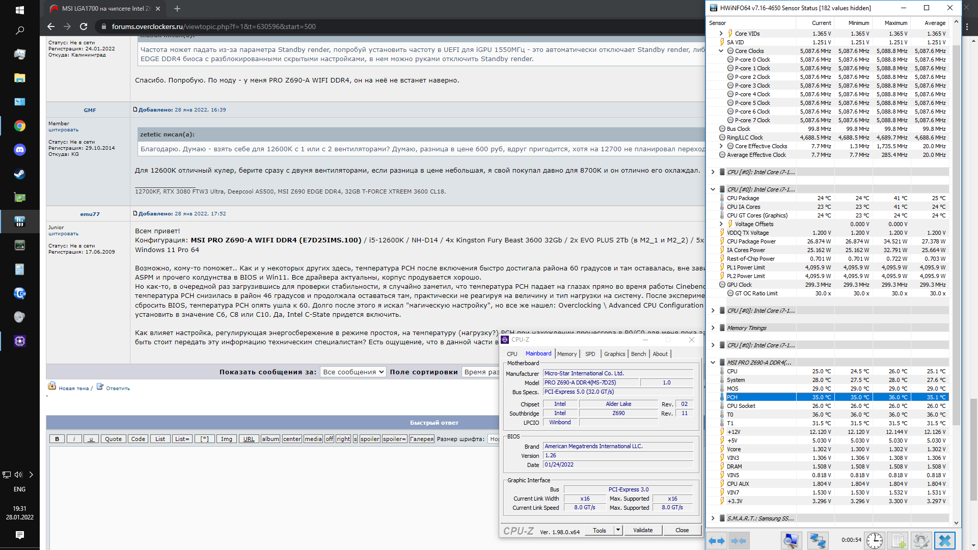 Возможно, кому-то поможет.. Как и у некоторых других здесь, температура PCH после включения быстро достигала района 60 градусов и там оставалась, вне зависимости от нагрузки, настроек ASPM и прочего колдунства в BIOS и Win11. Все драйвера актуальны, корпус продувается хорошо. Но как-то, в очередной раз загрузившись для проверки стабильности, я случайно заметил, что температура PCH падает на глазах прямо во время работы Cinebench R23. За 30 минут теста температура PCH снизилась в район 46 градусов и продолжала оставаться там, практически не реагируя на величину и тип нагрузки на систему. После экспериментов с памятью пришлось сбросить BIOS, температура PCH опять ушла к 60. Долго после этого я искал "магическую настройку", но все же нашел: Overclocking \ Advanced CPU Configuration \ Package C State Limit нужно установить в значение C6, C8 или С10. Да, Intel C-State придется включить.