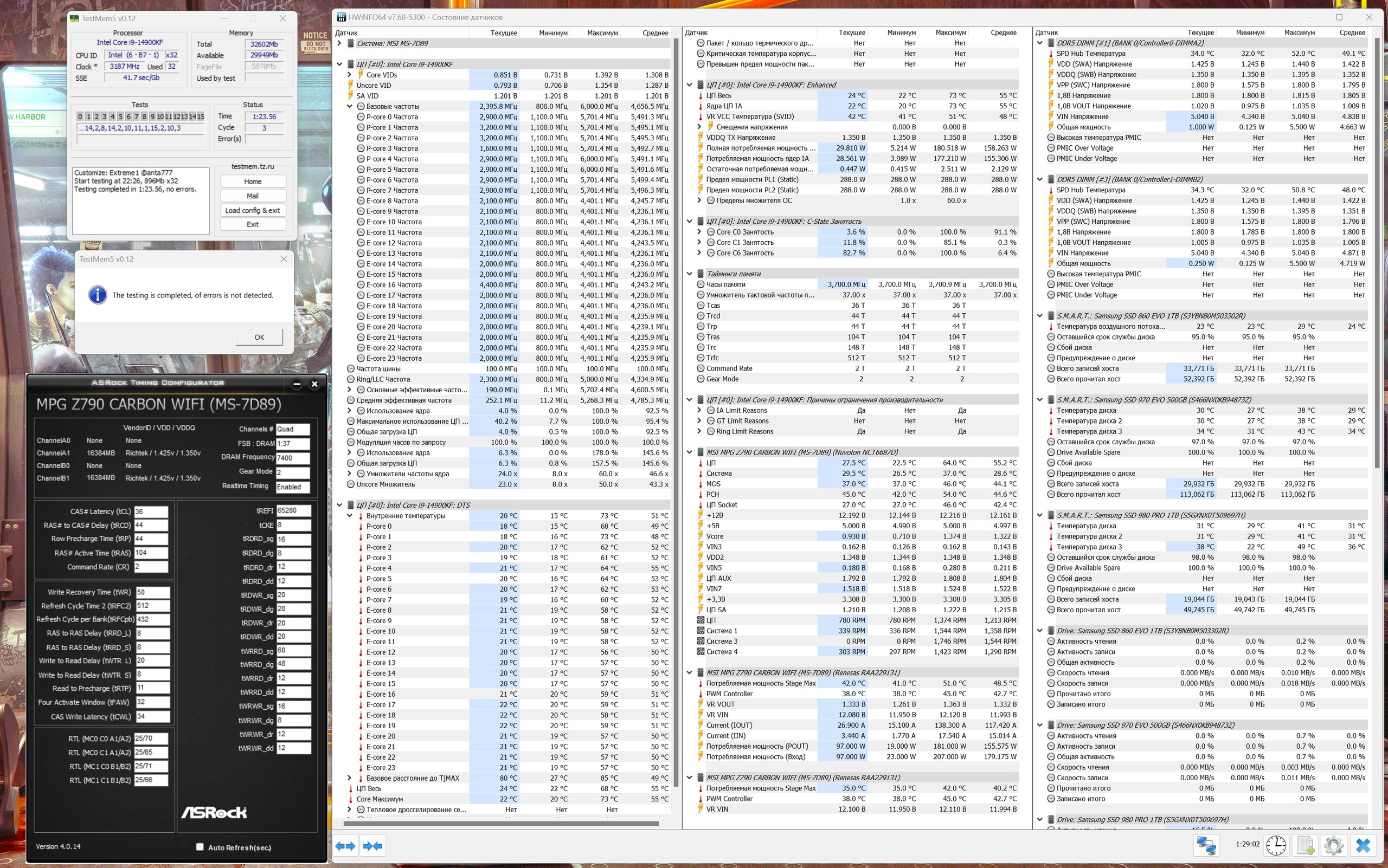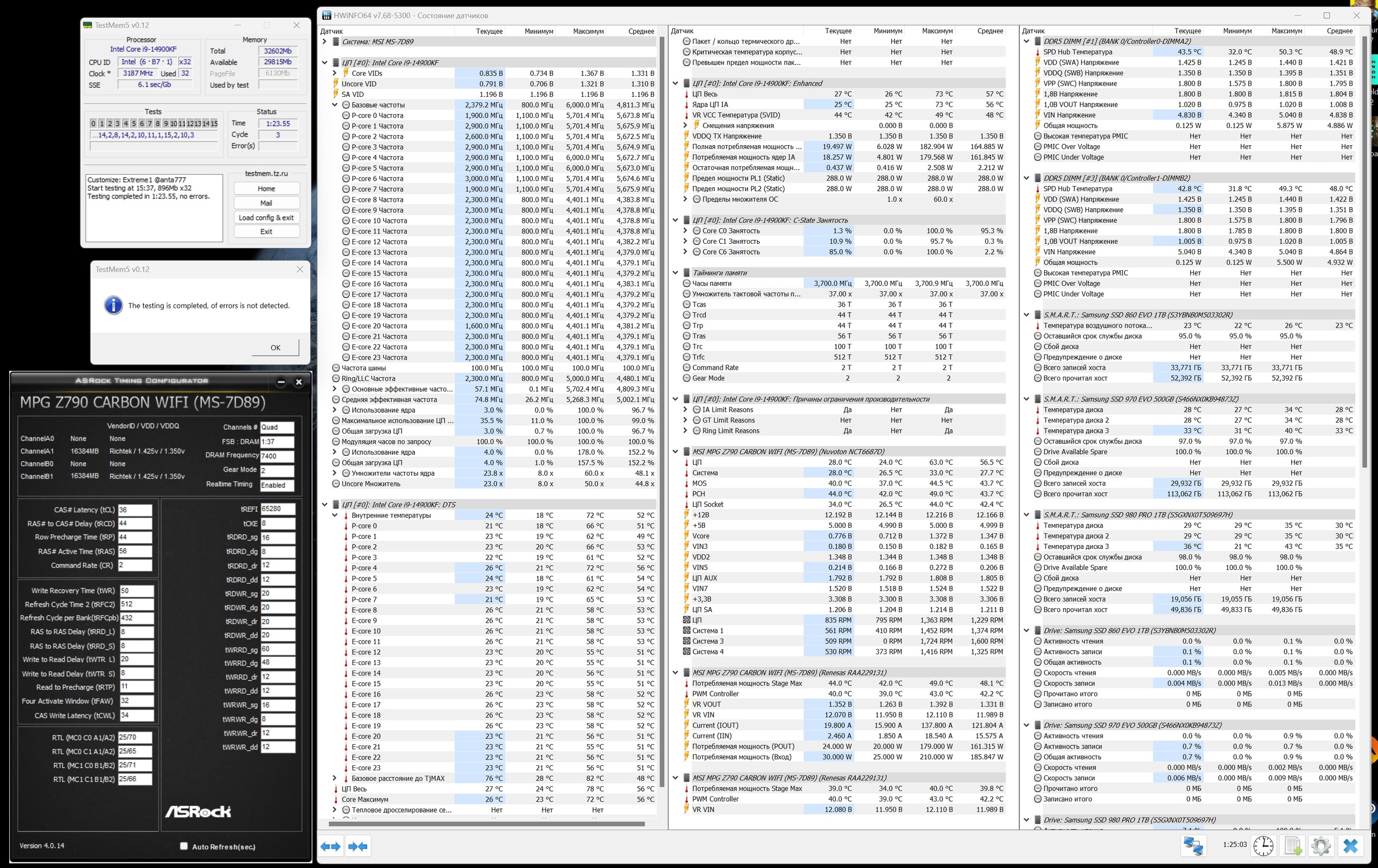 СА многовато, раньше моей ошибкой было по первому опыту в завышении этого напряжения, а оно тянет за собой остальные. На 7000 32-44 у меня было 1.1 и когда настраивал 7800-8000 думал надо будет сильно больше, но оказалось достаточно для полного стаба всего 1,11 по биос и 1,13 накидывает плата в тестах. Понятно что экземпляры разные, но для 7400 это все равно многовато имхо