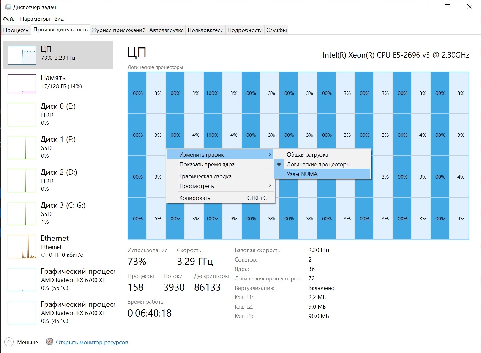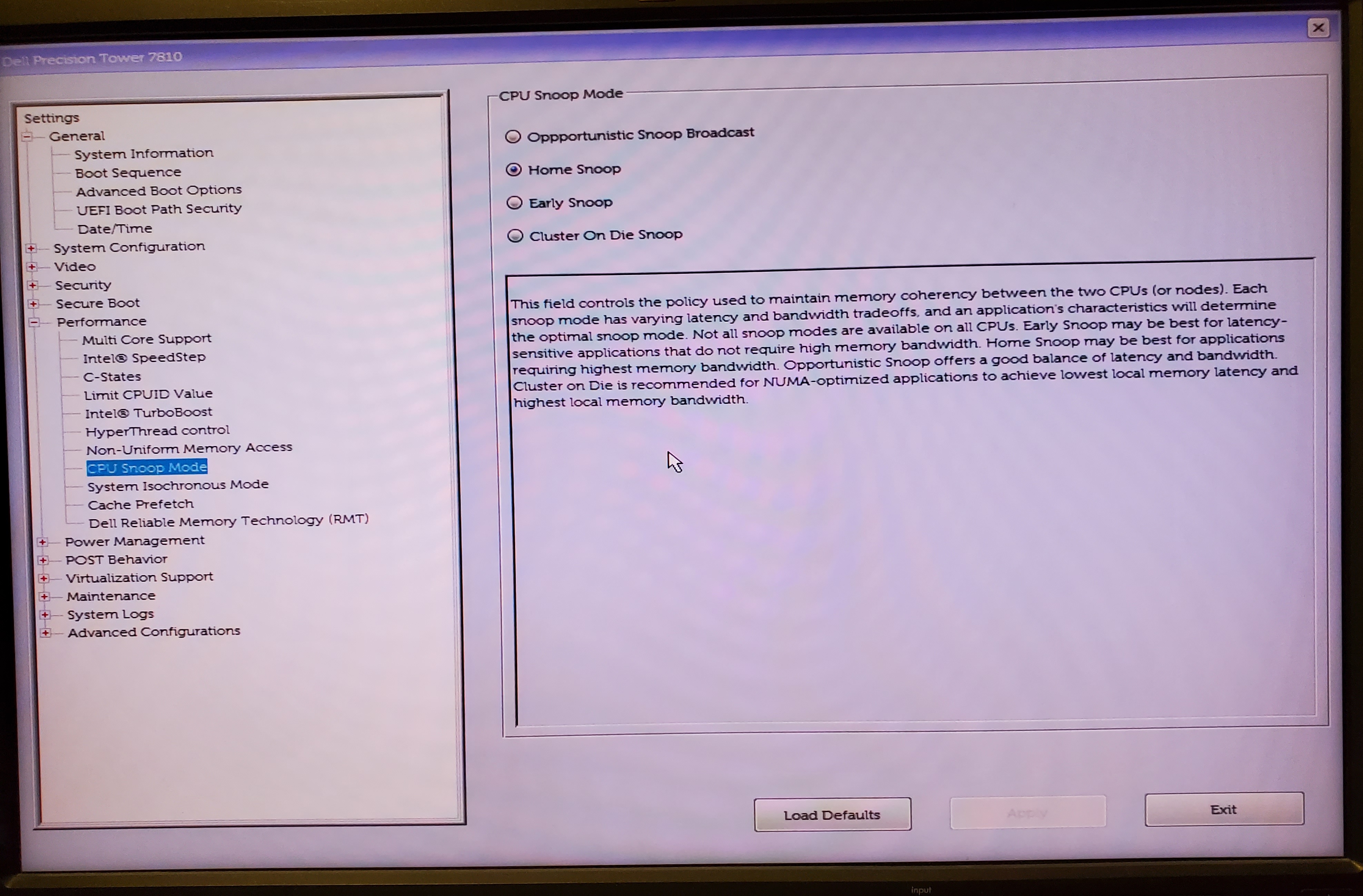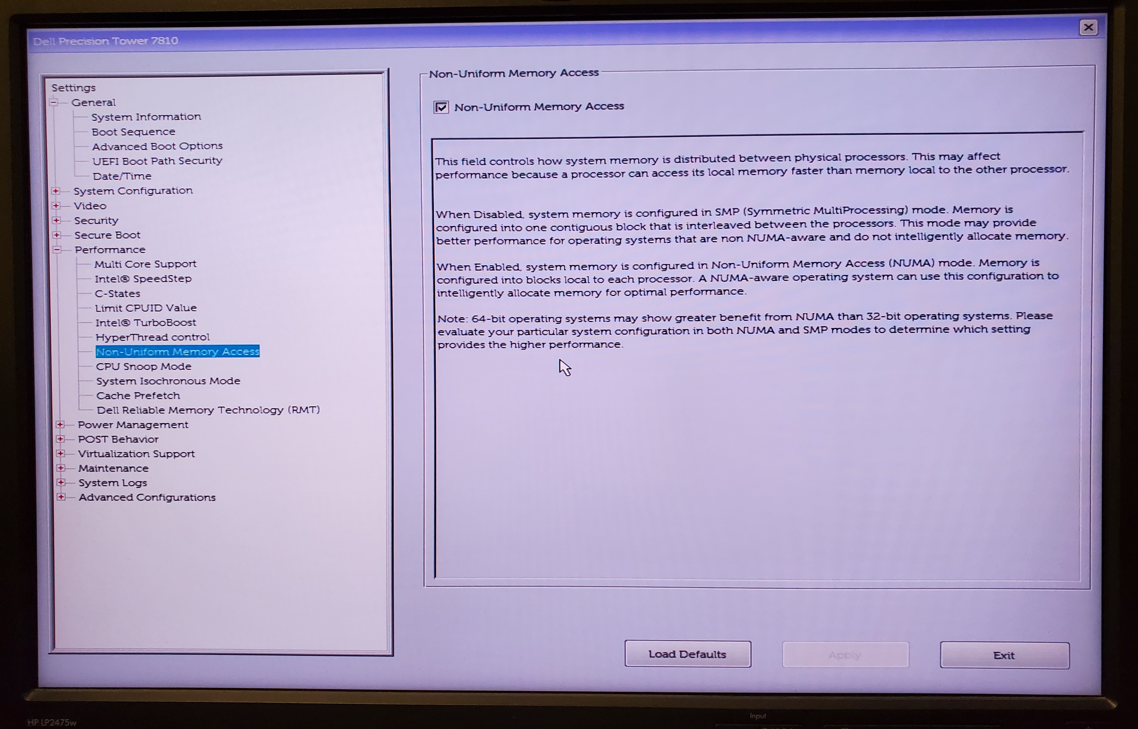 NUMA включена в биосе, я не заметил, искал NUMA, а оно Non-Uniform Memory Access называется Есть и другие настройки, относящиеся к памяти, типа улучшить латентность в обмен на пропускную способность, вобщем ещё поэкспериментирую. Также у меня HT было выключено, видимо из-за того что я 4627v4 запускал до этого и не сделал сброс на настройки по-умолчанию.