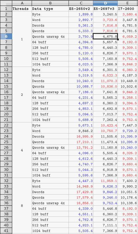 Прогнал тест чистой ПСП на том, что было под рукой. Результаты, мягко говоря, удивляют. То, как в 1-2 потоках й7 делает ксеоны, требует объяснения. То, как в 4-8 потоках вперёд вырывается 2650v2 тоже. Их всех должен был, как стоячих, уделывать 2697v3, но он слился. Протестировал бы и больше, но пока не хватает памяти, а переписывать код нет времени. Предлагайте разумные объяснения. Желающие могут написать в личку, получить утилиту (33кб, требует vcredist x86 15) и проверить сами. Тесты от byte до qword заполняют массив поэлементно. Тесты буферов используют memset(). Ничего не разгонялось, ни камни, ни память. При проведении тестов была замечена значительная разница в стратегии повышения частоты: й7 сразу бустит до макс. частоты, а ксеоны медленно и печально разгоняются, поэтому они были зажаты в план высокой производительности. Возможно й7й мог бы выжать ещё немного, но он и так проявил себя феноменально, так что я не заморачивался.