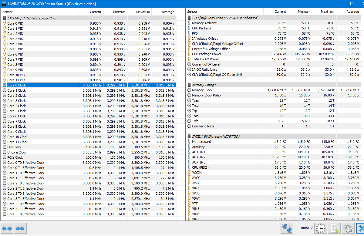 Для разгона множитилем как правило достаточно настроек стокового биоса, но в любом случае не прошивайте биосы предназначеные для анлока турбобуста процессров с заблокированым множителем, типа"с повышенным повер-лимитом и открытыми дополнительными настройками QPI". Для плат Huananzhi и других, использующих схожий биос, нужные настройки находятся в меню IntelRCSetup > Overclocking Feature > Processor и IntelRCSetup > Overclocking Feature > CLR\Ring. Основные параметры: Core Max OC Ratio — множитель ядер. Для Xeon E5 1650 v3 можно сразу установить 41-42. Core Voltage Mode — можно выбрать динамически (Adaptive) повышать напряжение или сделать статическим Core Voltage Override — выставляем напряжение на процессор в милливольтах, к примеру 1250, это будет 1.25 вольта (начать можно как раз с этого значения). Выше 1.30 поднимать с осторожностью! CLR Max OC Ratio — множитель контроллера памяти. По умолчанию равен 30, можно плавно повышать до 33-35 и тестировать производительность и стабильность. Core Voltage Mode — напряжение контроллера памяти. Аналогично Core Voltage Mode, но не выше 1250. Процессоры Haswell очень чувствительны к напряжению контроллера памяти, более-менее оптимальным считается 1.25 вольта, поднимать выше стоит с особой осторожностью.