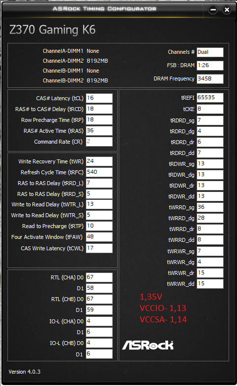 Так у тебя микроновские или хуниксовые А-die стоят, они максимум на 3000 гонятся при конских таймингах, хотя в интернете есть те кто ее на К6, Таичи и i7 запускали на 3100 при напругах близких к 1,5 и CL от 20 что не есть гуд, у меня же B-die, правда есть подозрение что не отборные , ибо пока выше 4000 не получалось завестись даже с напругой в 1,5В (видимо руки как у Себульбы с Звездных воинов растут ) P.S. Мои же стандартные тайминги сейчас такие, знатоки скажут что все криво (особо не заморачивался настройкой, времени мало):