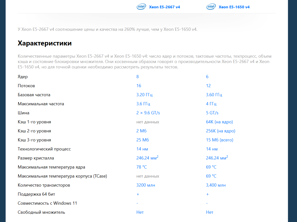 ну например 2667v4 удерживает максимальные частоты в ЛЮБОЙ нагрузке, а твоя тыква нет, кроме того архитектурно она так же отсасывает по кол-ву ядер и каши.