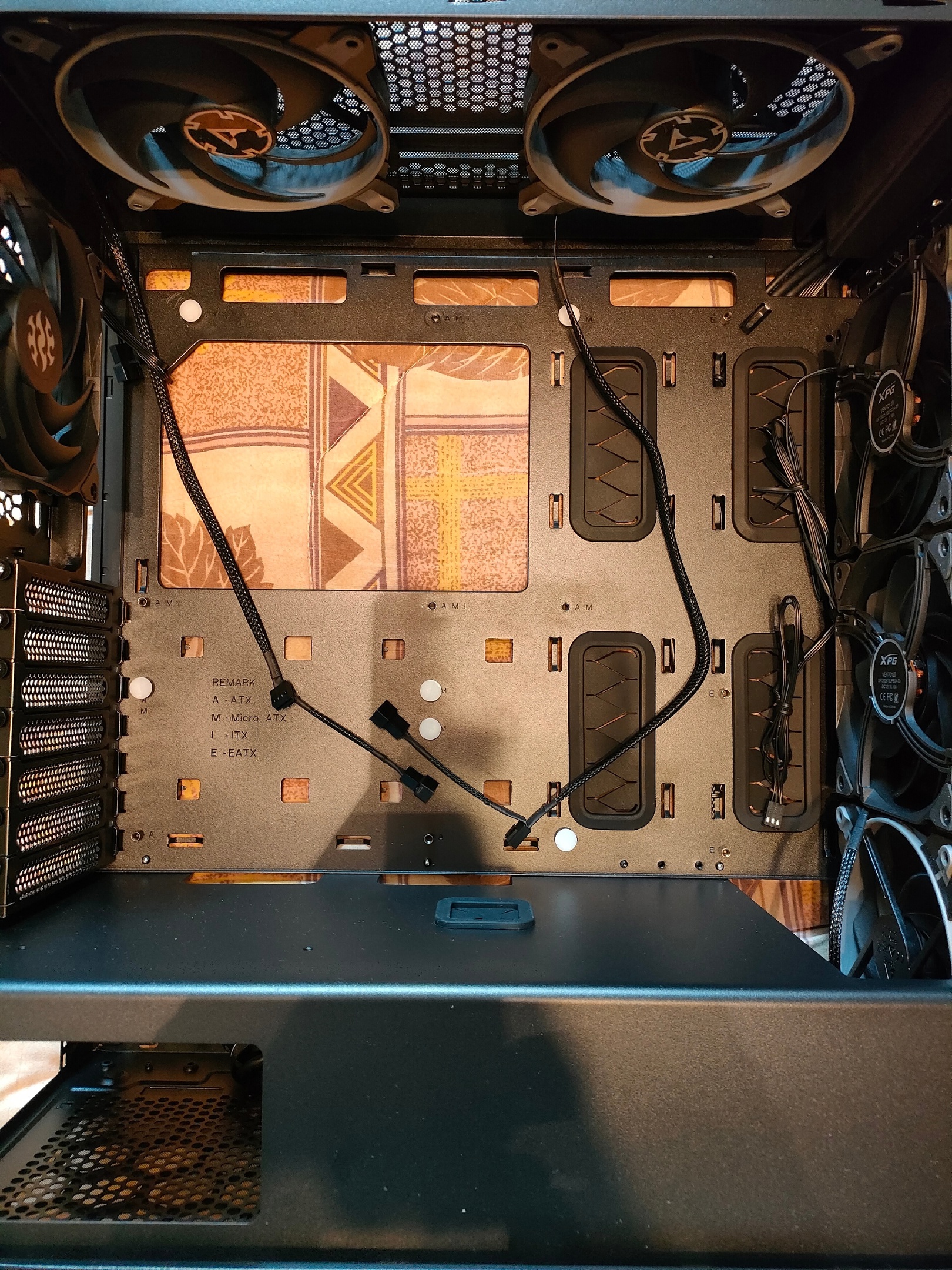 Корпуса от разных фирм разные. По уму ножек не должно быть нигде, где нет для них дырок в материнке. Я склеил два листа А4 скотчем, обвёл материнку (F8D plus)) и дырки для крепления, обрезал быстренько края и вложил в корпус - вкрутил ноги там, где дырки на мамке, ошибиться не возможно о) Две ноги по итогу были под компонентами - выкручены, две нужные дырки в корпусе пустые - вкручены, и для двух дырок в мамке нет дырок для ножек в корпусе - центр-центр и право-центр. Чтобы не прогибать материнку вдавливанием кулеров в зашёлки, собрал всё вместе с оперативой снаружи на родной пенке, потом всё аккуратно погрузил в корпус и закрутил длинной отвёрткой.