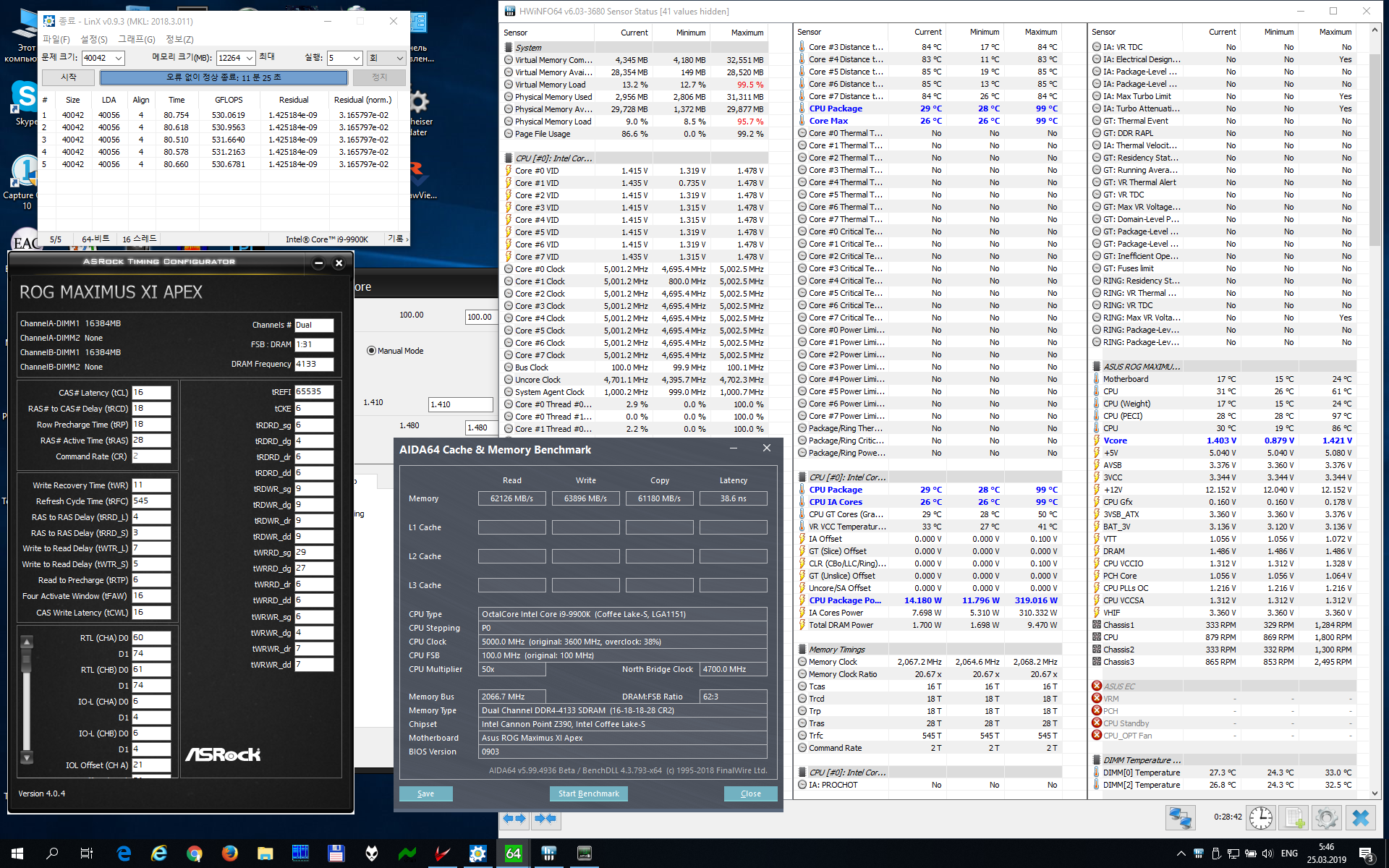 берём простой EKWB S240, термопаста Gelid GC Extreme, ставим 5.0 @1.41V LLC5, 2x16 4133-16-18-18, полностью отстроенную по вторичкам и третичкам, охлаждаем немного комнату для надёжности открытым окном (температура материнки упала на 10°), получаем 99° при 530 ГФлопс и 320W Package Power при ~1.26V под LinX. на самом деле камню хватает 1.38V с дропом до ~1.23V. при 1.37 (чуть-чуть не хватило напряжения, чтобы без невязок LinX был) был 91° при 276W